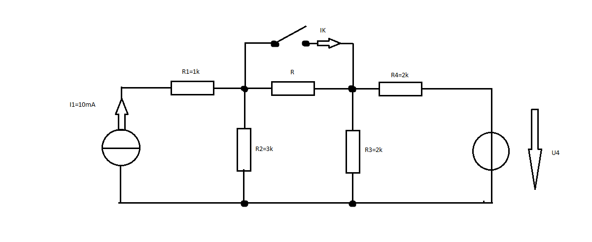 erstes Zauberwort: Linearität nutzen. bei geschlossenem Schalter U4 = 1V annehmen, Ik berechnen. U4 um den Faktor F erhöhen, bis der errechnete Ik auf F mal Ik = 6mA angestiegen ist. zweites Zauberwort: Ersatzspannungsquelle bei offenem Schalter: linken Teil ( I1, R1, R2 ) in eine Ersatzspannungsquelle umwandeln ( R1 = 3k , U0 = 30V ) vereinfacht die Schaltung wesentlich. rechten Teil in Ersatzspannungsquelle umwandeln. Beide Ersatzspannungsquellen vereinigen, führt zu ganz einfacher Schaltung