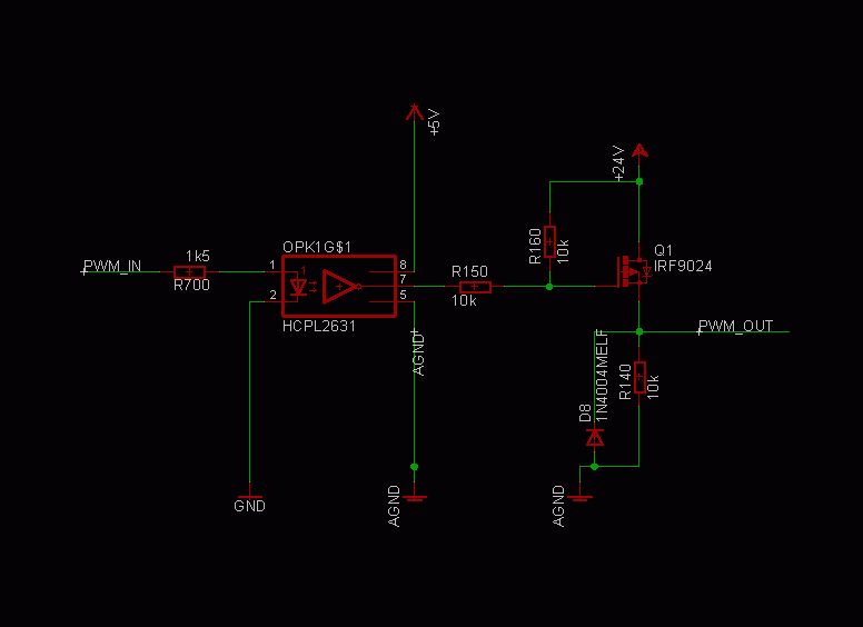Moin, bin schon Tage am Suchen nach einer guten Lösung. Aber nix zu machen, Optomos und Photomos und auch Optokoppler mit Gate-Treibern sind mir zu langsam. Standard-Aufbau mit MOSFET-Treiber hinter schnellen Optokoppler ist mir zu aufwendig/teuer. Das muß doch einfacher gehen! Ich möchte eine 7kHz-PWM bevorzugt über einem MOSFET ausgeben lassen. (dazu nehme ich gern einen IRF9024 P-Kanal o.ä.) Die PWM ist in 1000 Schritten unterteilt, so daß ich einen 0,14µs-Peak am Ausgang noch sehen will. Die Galvanische Trennung ist Pflicht. Komme mit 5Volt rein und möchte 24V/1A am Ausgang haben, also nix dolles. Hat jemand was parat? Im Anhang eine Schaltung zu Versuchszwecken, die ersetzt werden soll wie der Kenner bemerkt dauert damit die Zeit des Abfallens nat. zu lange. Bestens R. P.S. Ich lese sehr gerne Datenblätter und habe Google mit der Frage schon mehrfach belästigt.