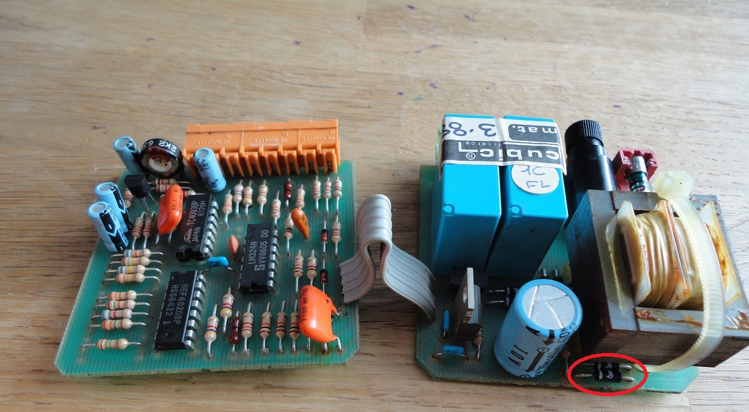 naja eigentlich möchte ich Beide austauschen um sie als Fehlerquelle definitiv auszuschließen. die infrarot Diode scheind einzelnd zu funktionieren. Jedenfalls kann man was sehen wenn man sie duch eine Digicam- oder Handybildschirm betrachtet. Der Transistor funktioniert einzelnd wohl auch. Bei Lichteinfluß hat er durchgang sonst nicht. beides ist an einer Elektronik Box angeschlossen die noch andere Sachen bei der Kaffemaschine regelt. Automatische Keselfüllung, Magnetventile, Pumpe... Wenn ich aber die Infrarotdiode anschließe funktioniert das alles nicht mehr. Ist ein bisschen schwer zu erklären. Also diese Elektronikbox hat 2 Platinen Bild habe ich angehangen Die Rechte Seite ist für die Steuerung der Automatischen Kesselfüllung. Da werden also Magnetventile und Wasserpumpe(beides 230V) geschaltet über die 2 Relais die auf 24V laufen. Dazu wird noch von dem kleinen Trafo 18V AC geliefert. Diese Seite funktioniert auch wie sie soll. Die Linke Seite ist für 1. Die ansteierung/ interpretation des Flowmeters 2. für die Ansteuerung der Tasten auf der Front der Kaffeemaschine (mauell start/stop und dann über Flowmeterinterpretation kleine Tasse große Tasse...) Alles auf 12V Basis Wenn ich also jetzt alles anschieße außer das Flowmeter (4 Kabel. jeweil 2 für Photodiode und Phototransistor) klappt alles wie es soll. Ich kann alles halt nur mauell mit start stopp regeln. Sobald ich jetzt aber die das Flowmeter anschließe. Eigentlich gehts nur um die Photodiode dann klappt gar nichts mehr! Also auch nicht bei der rechten Platine. Sprich die Magnetventile und die Pumpe bekommen kein Strom mehr. Sobald ich die Photodiode wieder abklemme geht wieder alles. Gruß Tim