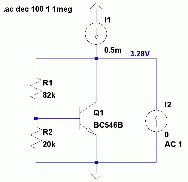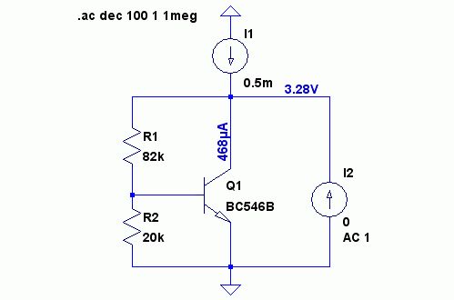 Meine Berechnung: Vaf=63V ut=0,026V bf=294 rce=Vaf/Ic = 134,6kOhm Steilheit S=Ic/(ut)=0.468mA/0.026mV=18mA/V rbe=BF/S = 16333Ohm rb=R2||rbe=8990Ohm Gegenkopplung b=8990/(82000+8990)=0,0988 Zout=1/( b*S +1/(82000+8990)+ic/vaf) Zout = 565Ohm Tipp: Man kann sogar den Strom im Arbeitspunkt anzeigen lassen.