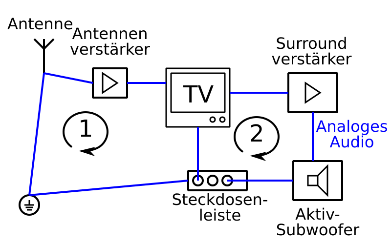 Dann mal zur Darstellung den Brummschleifen. Ursächlich für das Brummen sehe ich die Schleife #1, denn durch Abstecken der Sat-Anlage verschwinden ja die Störungen. Nun ergibt sich die Frage warum am Subwoofer Störungen ankommen, obwohl selbiger nicht Teil der ersten Brummschleifen ist. Die Störeinkopplung erfolgt indirekt durch den Spannungsabfall entlang der Erdung zwischen TV und Steckdosenleiste und ist Teil der Schleife #2. Parallel zu diesem Spannungsabfall liegt der Pfad TV->Surroundverstärker->Subwoofer->Steckdosenleiste. Somit koppelt ein Teil der Störspannung in das analoge Audiosignal zwischen Surroundverstärker und Aktiv-Subwoofer. Offen ist jetzt noch der Einkoppelpfad in die Brummschleife #1. Da sehe ich drei Möglichkeiten. * Induktive Kopplung über die aufgespannte Fläche der Brummschleife * Galvanische Kopplung entlang der Schutzerdung am TV und der Potentialausgleichsschiene * Galvanische Kopplung entlang der Schutzerdung der Sat-Antenne und der Potentialausgleichsschiene (Unwahrscheinlich, da nicht mit anderen geteilt) Auch wenn ich keine Erfahrung über EMV in Erdungssystemen habe, bezweifle ich, das das Problem an der Quelle gelöst werden kann. Somit muss das EMV-Problem an der Senke angegangen werden. Lösungen: * Impedanz zwischen Sat-Eingang am TV und Erdung Steckdosenleiste verringern (Testweise zusätzliche dicke Erdung (2,5mm² Litze) mit Schlauchring am Satstecker anbringen) * Impedanz zwischen Surroundverstärker und Aktiv-Subwoofer verringern. (Vorraussetzung: Masseklemme an beiden Verstärkern) * Auftrennen der Schleife #2 mit Audiotrafo (HiFi?) oder optischer Verbindung (Analog->Optisch->Analog) * Digitale Übertragung zwischen Surroundverstärker und Aktiv-Subwoofer (auch elektrische Schnittstelle nutzbar, da unempfindlich) Da ich es gerade lese. Die Antenne befindet sich also am Giebel und somit unterm Dach. Das verändert die Erdungsfrage ein wenig. Da habe ich mir eine zweite Grafik aus nachfolgendem pdf-Dokument ausgeliehen (Schöpfungshöhe). http://www.kleiske.de/vde%200855/vde0855_310108.pdf