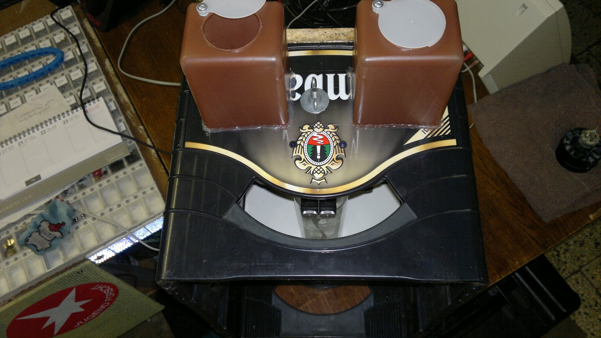 Hey, @Alex Bürgel: Das habe ich auch schon überlegt, aber der Deckel passt nicht auf jede Flasche und ich wollte möglichst alles einfüllen können. Gestern abend hatte ein Kumpel von mir noch eine super Idee, die perfekt passt! http://www.bruja.de/catalog/product_info.php?products_id=402 So eine Kaninchentränke eignet sich hervorragend! Gruß Ole