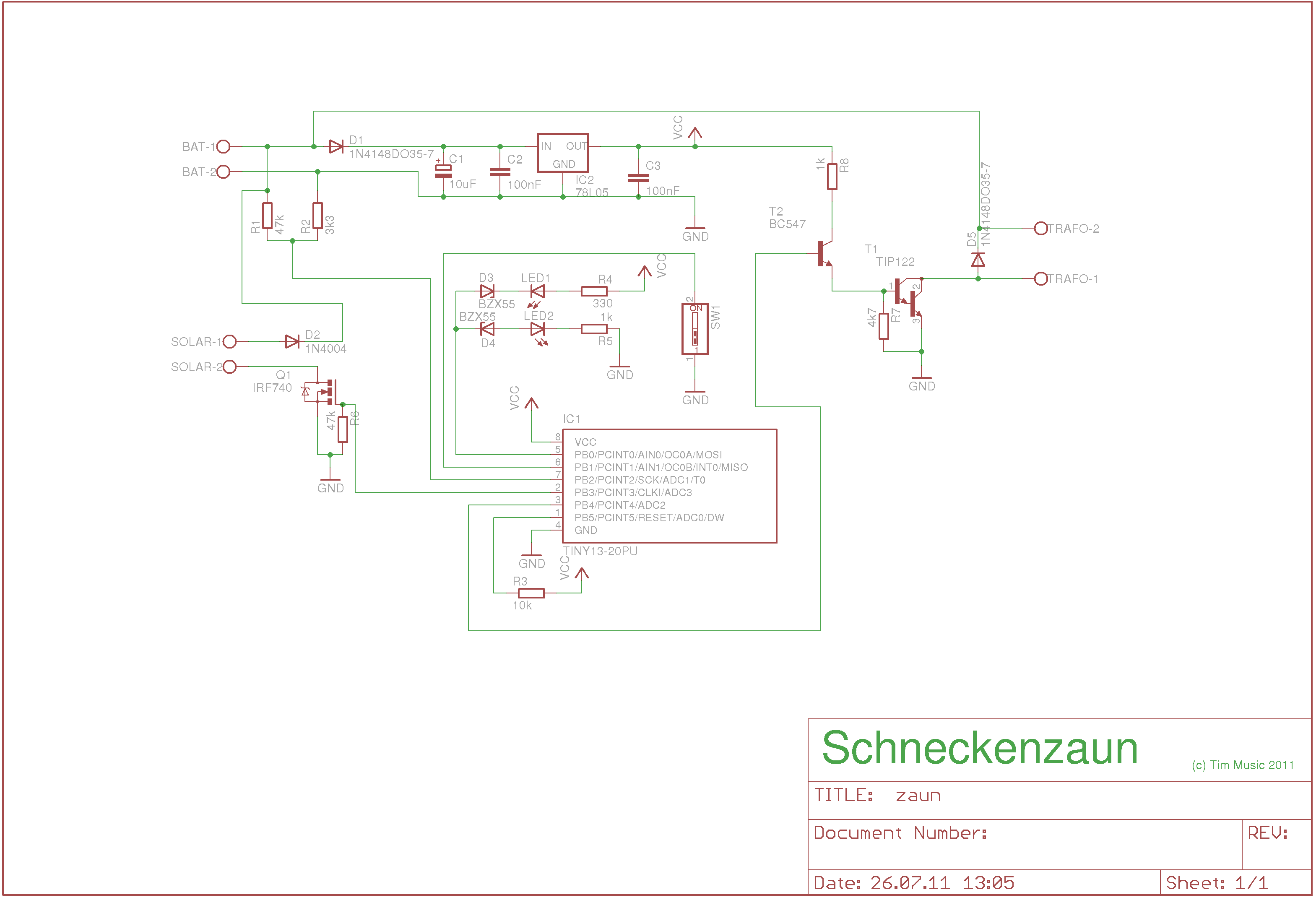 Hallo Leute, Bevor ich zu meinem Problem komme erst einmal eine kleine Vorgeschichte. Meine Familie und ich haben ein hochbeet gebaut. Nur merkten wir schnell dass es im Allgäu besonders hungrige Viecher gibt. Deshalb das alte weidezaungeraet von Knolles Elektronik basteln Seite, das langsam aber sicher verstaubt, herausgezogen und 2 Drähte um das beet rumgespannt. Funktioniert ganz gut, aber wir wollten doch eine Solar-Variante. Dann halt was mit nem tiny. Da geht die bleigel ladeschaltung noch mit rein. Die Idee dazuauch gleich wieder hier aus dem Forum abgekupfert. Diverse Testproggies laufen auch auf dem tiny. Und jetzt hier das Problem: das alte weidezaungeraet als Vorbild genommen wird ein trafo getaktet von dem attiny85-20. Der tiny bekommt geregelte 5volt, der trafo ist an einer Seite an 12 Volt plus, das andere Ende ist mit dem fet bzw. Transistor verknüpft der den pol dann auf Masse legt. Nur der fet, irf740 schaltet zwar mit einem pulldown von 150kohm die last an bzw ab ( Glühbirne funzt ) aber der trafo gibt nichts hochspannungsmaessiges raus. ( hab getestet mit kleiner Schwester :P, spass ) Der Transistor tip122 schaltet nur 50 mA durch, es sollten 200 fliessen. Der irf sollte zum trennen und anschließen der Solarzelle an den Akku da sein und ist leicht ueberdimensioniert. Der tiny wird durch nen tiny13 ersetzt. Schaltplan gibt's morgen noch schön mit Eagle gemalt. Wenns funktioniert. Dann stell ich ma den Plan und das hexfile hoch. Danke für die Hilfe und gute Nacht :) Tm