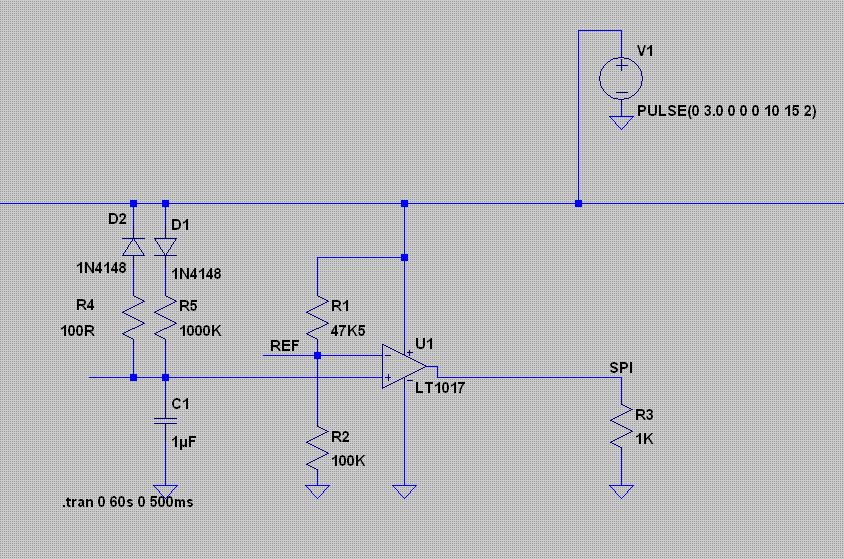 Wenn eine kleine Modifikation erlaubt ist, nutze doch die Schutzdiode und lege den Entladewiderstand statt an GND an den Komparatoreingang.