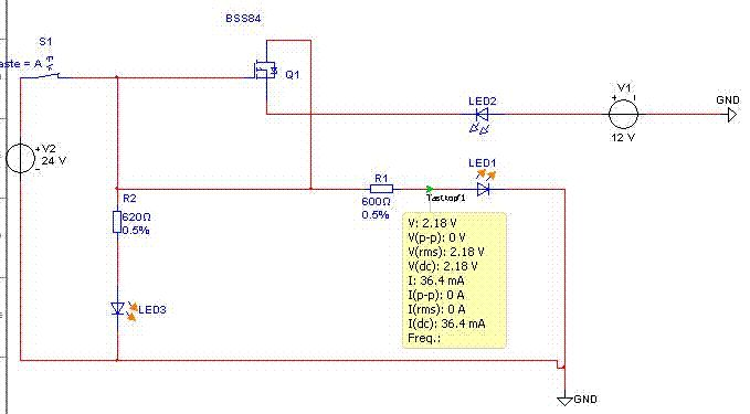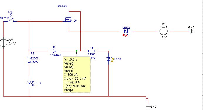 So wird nur die Vorwärtsspanung der LED1 gemessen. Darum die 2V. (Wie schon in der 1. Variante ohne Widerstand, dort einfach mit zu grossem Strom) Direkt hinter dem FET messen, oder als Verbraucher zum Beispiel ein 24V Lämpchen nehmen (für die Simulation)
