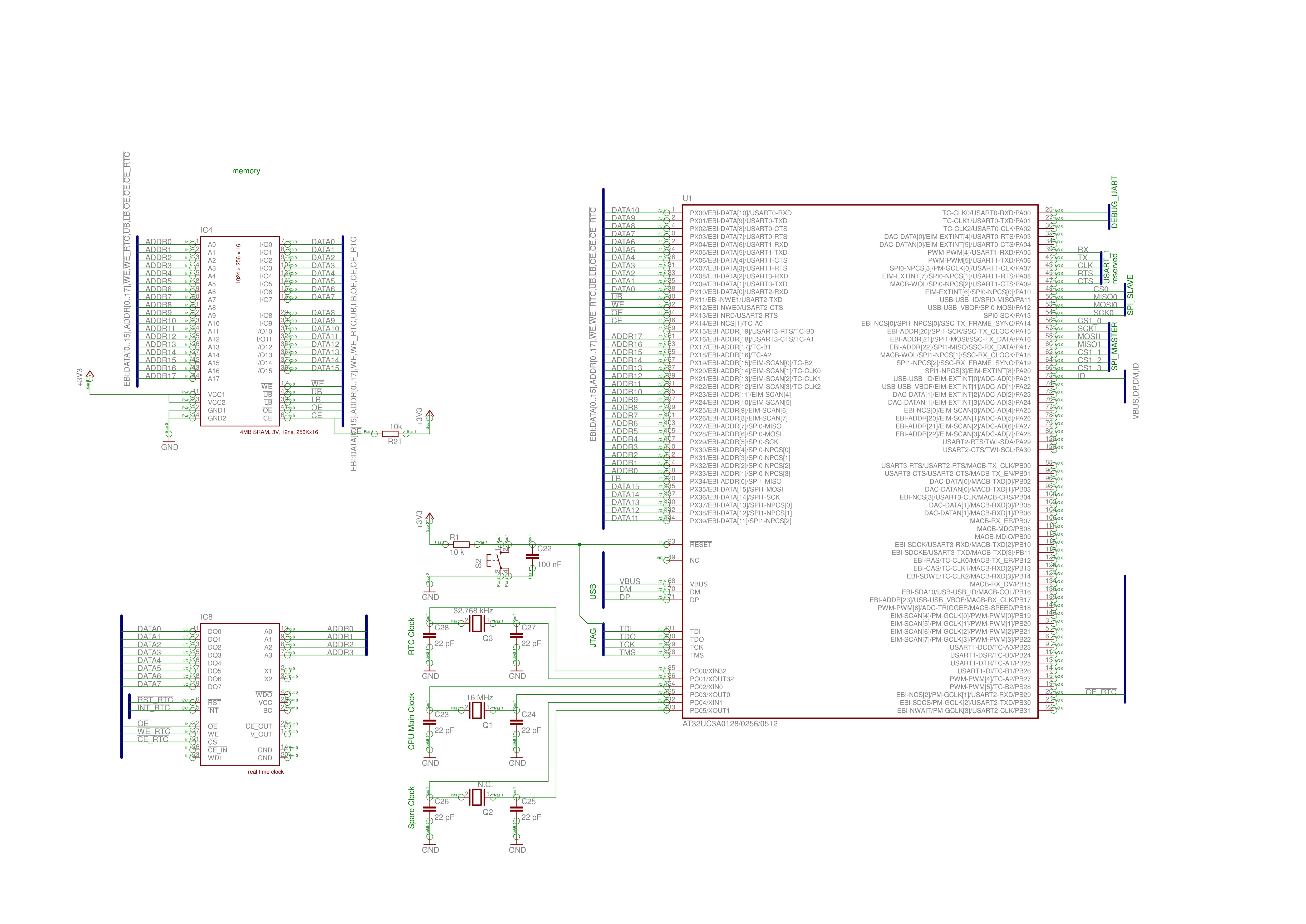 Hallo, ich erstelle gerade meinen ersten Schaltplan in Eagle und möchte u. a. den EBI-Bus vom AVR32 verwenden. Er soll einen SRAM (18-Bit Addressleitungen) und einen RTC (8-Bit Addressleitungen, mit SRAM-basierender Pinbelegung) bedienen. Ich bin jedoch total verwirrt ob ich die Adressleitungen nun richtig angeschlossen habe oder nicht. Am meisten Bedenken habe ich, ob die Leitung /LB am Pin PX43(EBI-ADDR[0]) vom AVR wirklich an der richtigen Stelle ist. Deshalb würde ich bitten ob jemand mal einen Blick drauf werfen könnte. Die restlichen Leitungen (soweit sie denn schon eingetragen sind) sollte bereits ok sein.