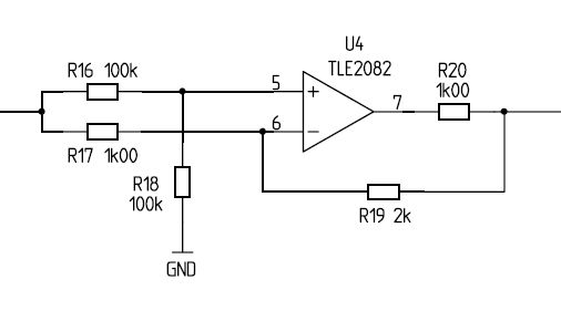 zumindest ist jetzt klar, daß R20 der Strombegrenzung dient wenn via Diode V4 die negative Ausgangsspannung zum AD Wandler hin begrenzt wird. Ansonsten fällt mir nur ein: Durch den Trick die Eingänge des OPs auf Ue/2 statt auf Masse zu halten sinkt der Eingangsstrom fast um Faktor 2. Aber da hätte man auch die Widerstandswerte des inv. Eingangs vergrößern können. Insofern ist mir der Nutzen von R16 R18 auch nicht ganz klar. Vieleicht kann jemand mit mehr Ahnung noch Licht ins Dunkel bringen.