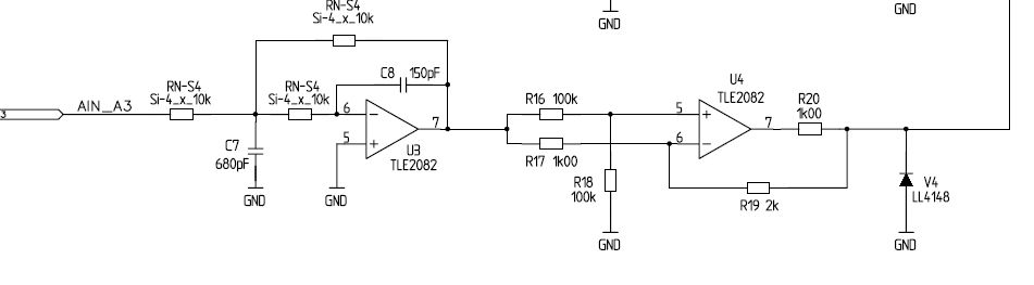 > Wenn du uns sagst, wo du die Schaltung her > hast, kann man vielleicht noch etwas mehr dazu erzählen. Vor dem Schaltungsauschnitt ist noch eine invertierende OP-Schaltung. AIN_A3 kommt von einem optischen Sensor (U ~ Beleuchtung). > Was passiert rechts von deinem ersten Schaltungsausschnitt? Der Ausgang geht auf einen A/D-Wandler.
