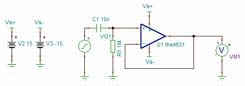 Du solltest bei Koppelkondensator folgendes beachten: Wenn der Tastkopf an eine hohe DC-Spannung angeschlossen wird, liegt diese Spannung am Kondensator C1 an; dieser muss also eine entsprechend hohe Spannungsfestigkeit haben. Oder du musst sicherstellen, dass keine hohe DC-Spannung am Tastkopf anliegen kann. Rainer schrieb: > Welchen OP-Typ würdest du für diese Anwendung verwenden? Das größte Problem ist die Slew-Rate, also die maximale Anstiegsgeschwindigkeit am Ausgang. Bei 10V und 2 MHz ergibt das rechnerisch 125 V/us. Es muss also schon ein High-Speed-OP sein Dann sollte er wenig Input Bias Strom haben, also FET-Eingänge. Und dann auch noch +/- 15V Versorgungsspannung, da wird die Luft schon dünn. Warum muss es eigentlich 10V am Ausgang sein; würden 1V nicht auch reichen? Da ist dann die Slew-Rate um Faktor 10 kleiner und es würde eine +/- 5V Versorgung reichen. Dann wäre es wesentlich einfacher, einen passenden OP zu finden.