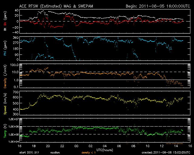 Um 13:55 soll ein größerer Sonnensturm eintreffen (+/- 7h). (5.8.11) Das letzte mal war es der Tag vor Fukushima. Bin mal gespannt was am 6.8.11 so passieren wird. Normalerweise sind die Sonnenwinde 300..700km/s schnell. Quelle: http://spaceweather.com/ Zitat: oving at an estimated speed of 1950 km/s, this CME is expected to sweep up two earlier CMEs already en route. Analysts at the GSFC Space Weather Lab say the combined cloud should reach Earth on August 5th at 13:55 UT plus or minus 7 hours: "The impact on Earth is likely to be major. The estimated maximum geomagnetic activity index level Kp is 7 (Kp ranges from 0 - 9). The flanks of the CME may also impact STEREO A, Mars and Mercury/MESSENGER." High-latitude sky watchers should be alert for auroras. Sorry, Datei ist leider animiert und so groß und heute leider nicht mehr auf spaceweather.com zu sehen, daher der Anhang.