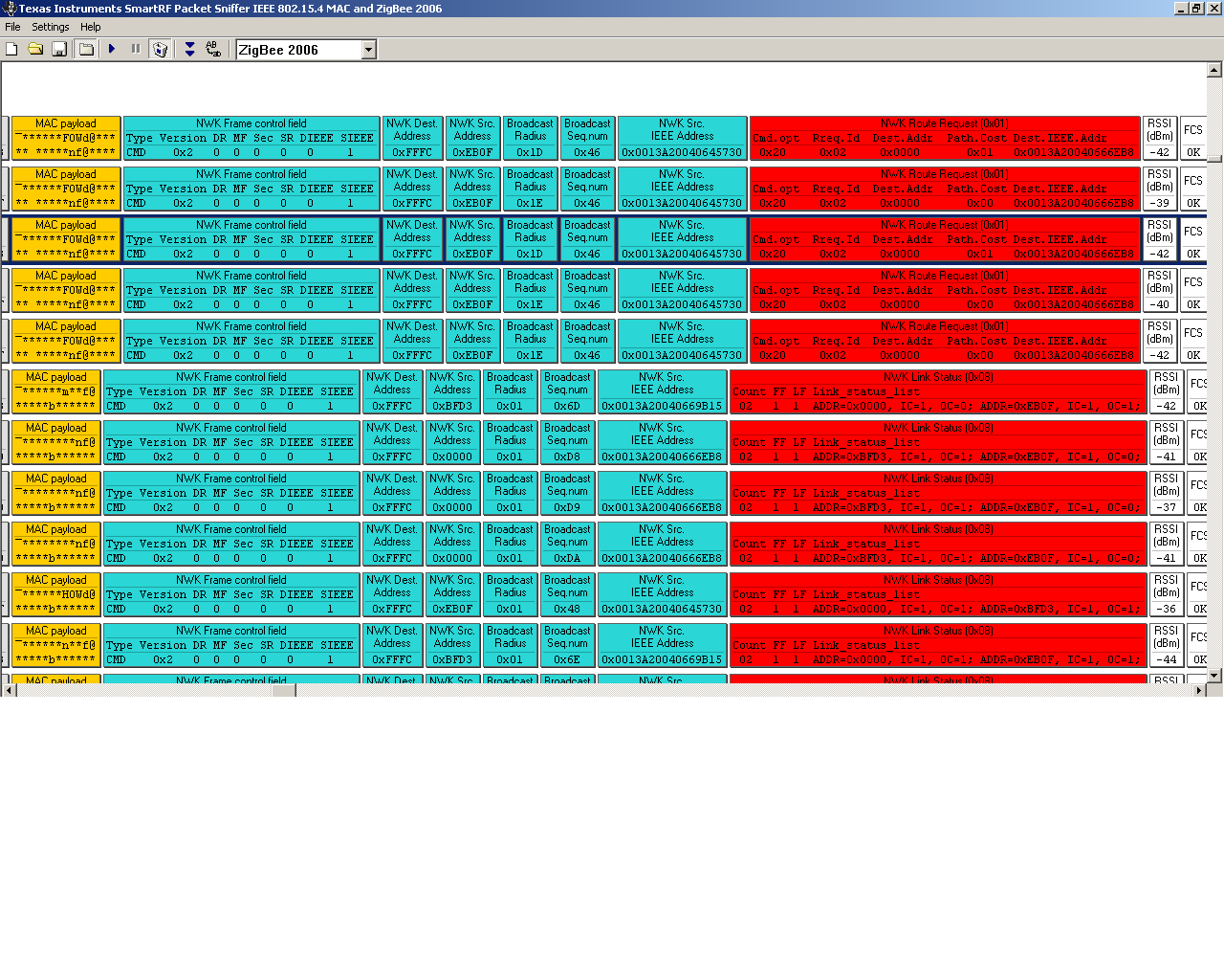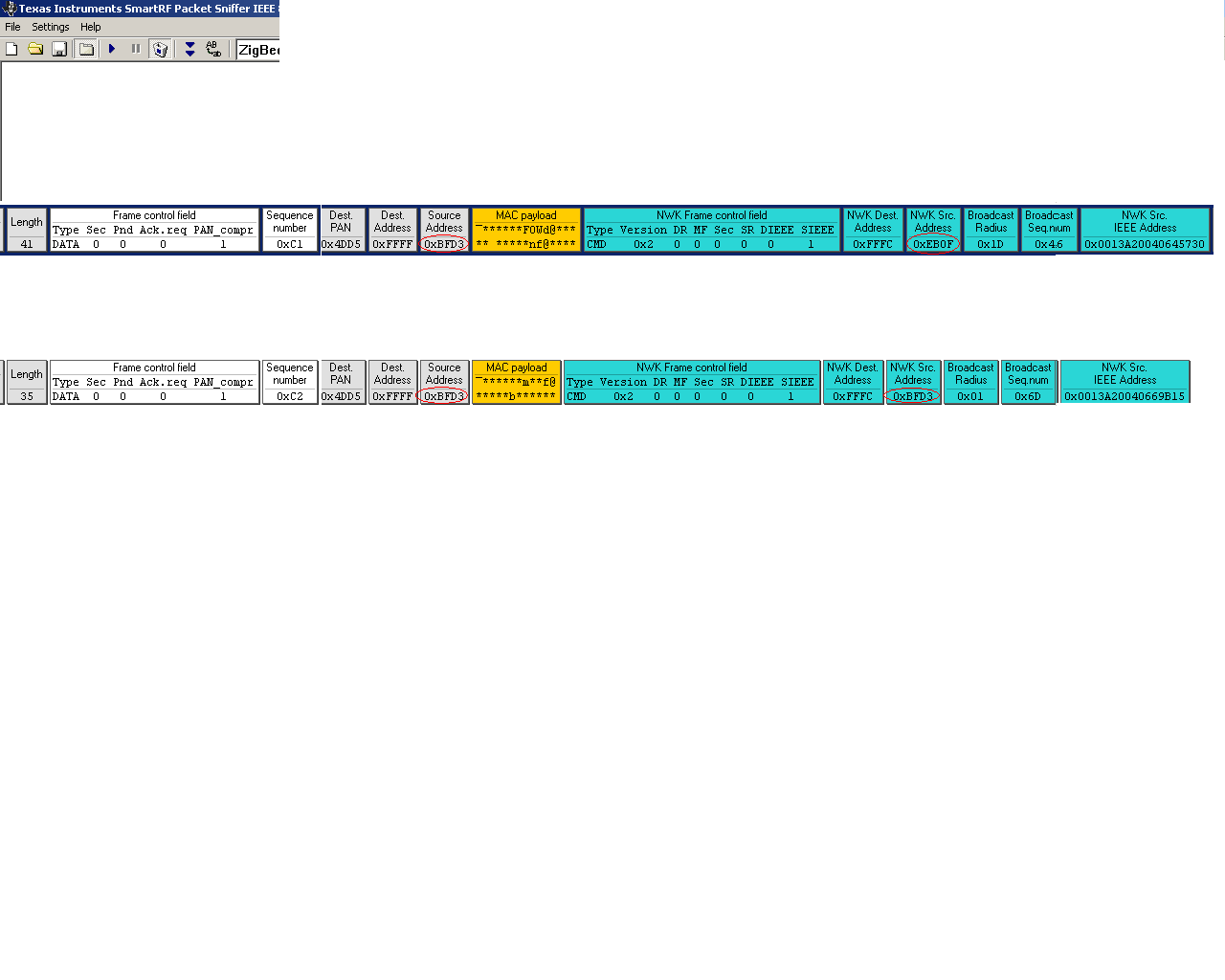 Danke Jörg Wunsch für deine Antwort. tut mir leid dass ich spät anmelde! die kurz-Mac-Adresse ändert sich bei Weiterleiten der Nachricht Koordinator->Router->Router aber Nwk Adresse bleibt gleich. habe ich richtig verstanden ? das netz die ich sniffe gehört dazu die Router mit der Adresse:0013...730 ist sogenannt Hausnetz. die zweite nachbarnetz gehört dazu die Router 0013....B15. die Entfernung zwischen die Netzen ist 2m. meine frage (wie du siehst in die beide Bilder )worum es geht diese wiederholten Packeten.in andere Stelle wiederholt sich (Get Befehl von Kor., Ack von Kor. und Router und Nutzdaten von Router->Kor.) Danke