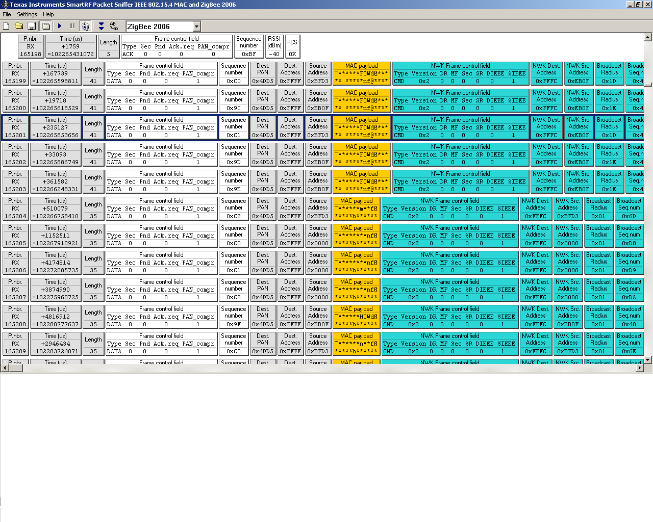 Hallo! um ein ZigBeenetz (erste Packet) zu sniffen, benutze ich CC2531 von Texas Instrument. laufte es ganz gut, aber als ein zweite Zigbee netz aktiv war (zweite Packet),tauchten eine Menge fehlerhafte Packeten. ich habe zwei Fragen: -die packeten kamen auch alle doppelt(Datax2,Ackx2,..) -mac Source adresse ist anders als nwk Source adresse. für jede Antwort wäre ich sehr dankbar.