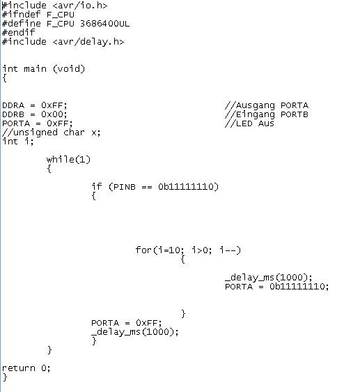 Hallo zusammen, Ich bin gerade dabei ein Programm zu entwickeln, das bei Knopfdruck einen bestimmten Wert herunterzählt, währenddessen einen Ausgang ansteuert und bei abgelaufener Zeit diesen Ausgang wieder abschaltet. Diese Funktion ist im Anhang bereits realisiert. Jedoch möchte ich, dass bei erneutem Drücken des Tasters während der Zähler herunterzählt die ursprüngliche Zahl im Zähler zum aktuellen Zählerstand addiert wird. Beispiel: Zählt von 10 nach 0, Zählerstand ist bei 6, nach erneutem Drücken des Tasters ist der Zählerstand bei 6 + 10, also bei 16, jetzt zählt der Zähler von 16 naach 0, Zählerstand is inzwischen bei angenommen 3, nach erneutem Drücken des Tasters is der Zählerstand nun bei 3 + 10, also bei 13 usw... Vielleicht kann mir jemand helfen Danke schon mal für die Bemühungen Basti