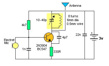 Hier findet sich eine Fülle von Anregungen und auch zahlreiche Schaltungen zum Thema: http://www.adag.be/Elektronik/Minispione/Inhalt.html Es empfiehlt sich, den rot gedruckten Hinweis zu beachten ;-)