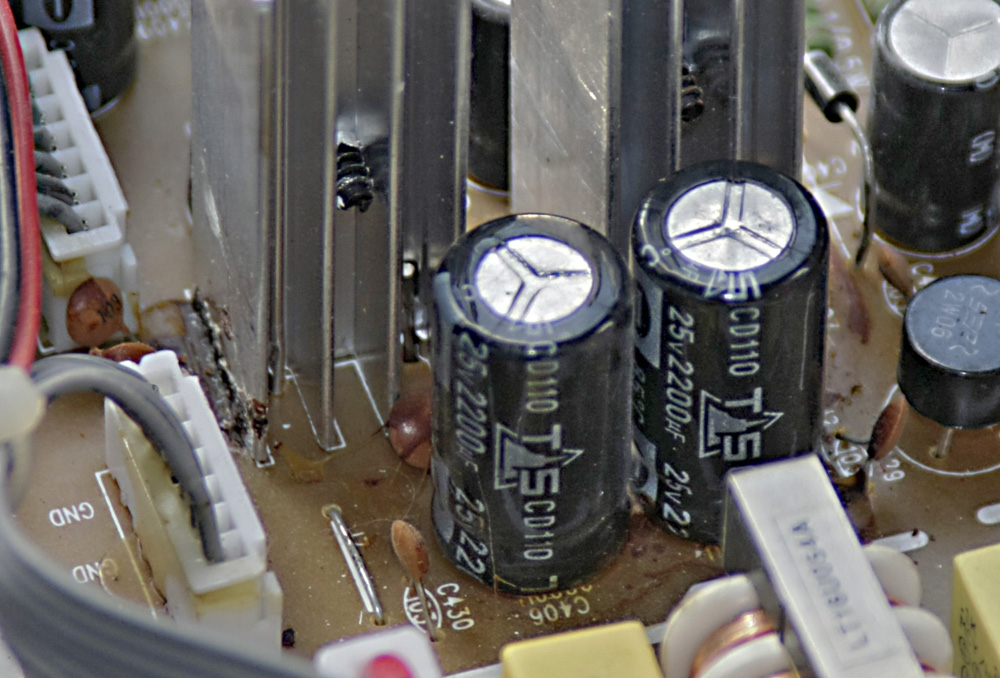 Zum plötzlichen Tod von ELKOs kann ich folgendes Beitragen: Azubi-Kollegen haben während des ersten Lehrjahres in der Lehrwerkstatt beim großen S damal nen ELKO in 230V Steckdose gesteckt. Danach hat "puff" gemacht und eine Rolle Elektroden/Elektrolytflyssigkeit kam herausgeschossen. Ein plötzlicher Tod kann also mit Überspannung zusammenhängen. Für mich sieht das Bild so aus als wären die ELKOs ausgelaufen. Wenn das Klebstoff wäre, warum sollte er auf der Platine sein?