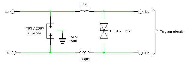 Bei Farnell gibts mehr Auswahl, auch 85V oder 130V. http://de.farnell.com/stmicroelectronics/smbj85ca-tr/transil-600w-85v-bidir-smb/dp/1749367 Würde die 85er bidirektional reichen, oder wäre das schon zuviel? Wenn da ein Gasentladungsableiter davor kommt, wird 90V auch schon knapp, oder? Es gibt 90, 230 oder mehr, dazwischen kommt nichts. http://de.farnell.com/littelfuse/sl1003a230sm/gasentladungsableiter-smd-230v/dp/1815494 Wenn 90V für Telefon zu wenig ist, wo werden die dann eingesetzt? Ich nehme an, die Spule in der Schaltung begrenzt Transienten für die VDRs? In vielen einfachen Schaltungen ist die nicht drin. Mitunter wird empfohlen, die Widerstande durch PTCs / Halbleitersicherungen zu ersetzen. Bringt das was? Die Leitung selbst liefert eh nur 20mA, und für Transienten sind die doch viel zu träge, oder?