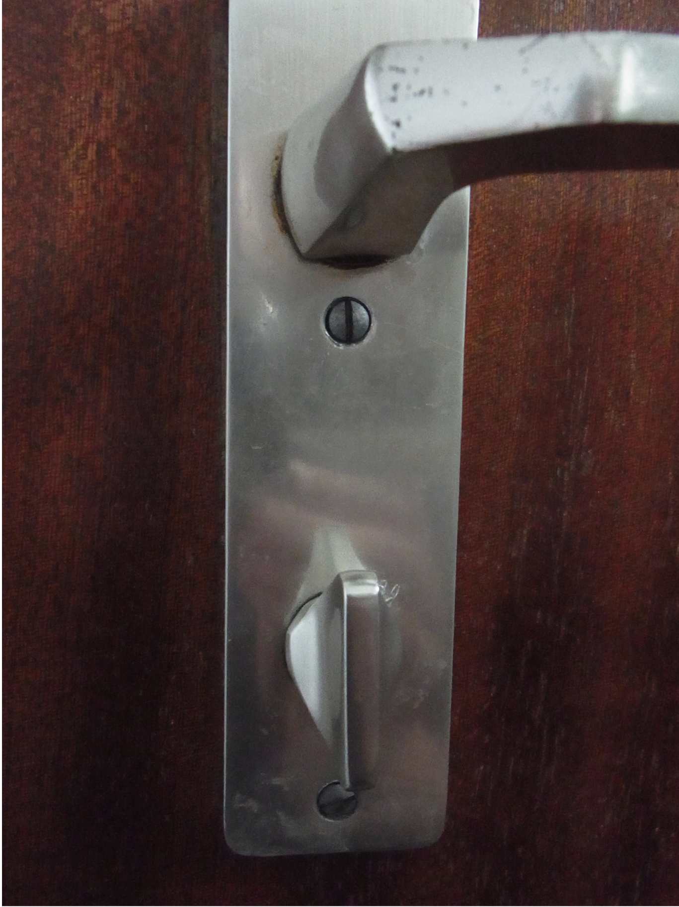 Der Vierkant des Auf-Zu-Knebels sitzt locker in der Farbscheibe. ( Hier nur eine Münzscheibe, weil man mit einer Münze das Teil von Außen öffnen kann.) Drücker abmachen und dann kann man das Langschild abschrauben. Wenn es schwer geht, gibt es etwas Passungsrost. Dann Rostlöser sprühen und wackeln, irgendwann löst sich das.