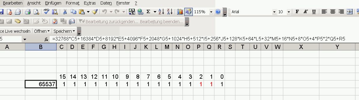 Könnte bitte mal jemand das Excel hier aufmachen und nachsehen, was der ausrechnet? Ich bilde aus einem 16 Bit Binärmuster die Dezimalzahl und sollte , wenn alles auf 1 steht 65535 rauskommen. Excel 2003 rechnet aber 65537. Seht es euch bitte mal an. Die hinteren roten Bits machen irgendwie Ärger, obwohl die Formel stimmt. Rauskopiert: =32768*C5+16384*D5+8192*E5+4096*F5+2048*G5+1024*H5+512*I5+256*J5+128*K5+ 64*L5+32*M5+16*N5+8*O5+4*P5*2*Q5+R5 Ist das bei euch auch so???