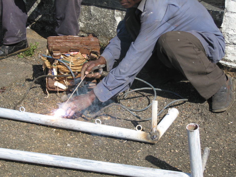 Erlebnisbericht aus "The Republic of The Gambia"! R E S P E K T -- R E S P E K T -- R E S P E K T -- R E S P E K T -- Das nenne ich die hohe Kunst. Der angstlose Schweisser hat nie eine Schule besucht, konnte weder lesen noch schreiben,hat aber mit Erfindungsreichtum und unendlicher Geduld ein Gebilde konstruiert das sogar recht passabel funktioniert. R E S P E K T -- R E S P E K T -- R E S P E K T -- R E S P E K T -- Der Stromgenerator war ein Maibach-Diesel aus einem 2.WK Panzer mit angeflanschtem 1~ 400V fremderregten Generator von einem italienischen Vorkriegsschiff. Die Erregung bestand aus einer Ansammlung von 12V Bleiakkus die mit Fahrradspeichen untereinander verbunden waren. R E S P E K T -- R E S P E K T -- R E S P E K T -- R E S P E K T -- Kein Internet, kein Forum, keine Ausbildung, kein Schutzleiter, alles Erdfrei. R E S P E K T -- R E S P E K T -- R E S P E K T -- R E S P E K T -- Nur Draht mit Packpapier isoliert, gegen Überlast geschützt durch das lose Eisenpaket und Strom einstellbar über den magn. Fluß durch Veränderung der Zurrbänder. R E S P E K T -- R E S P E K T -- R E S P E K T -- R E S P E K T -- Eine gefundenen Batterieklemme als Elektrodenhalter und lockere Rödelverbindungen der Schweisskabel machen eine einfache und komfortabele Einstellung des Stromes möglich. R E S P E K T -- R E S P E K T -- R E S P E K T -- R E S P E K T -- die Helfer mit großen Fassdeckeln die für Frischluft sorgen unter freiem Himmel verhindern wirkungsvoll eine Zinkvergiftung. R E S P E K T -- R E S P E K T -- R E S P E K T -- R E S P E K T -- Ich war jedenfalls grenzenlos begeistert was so möglich ist wenn man aus Scheiße Konfekt machen muß und sich selber helfen kann wenn man nur will. Leider waren das alles Moslems die ja bekenntlich keinen Alkohol trinken, sonst hätte ich den Jungs einen Kasten Bier ausgegeben. Dafür bekamen sie alle meine Schuhe, Zahnbürsten und sonstiges Geraffel wie Kugelschreiber, MP3 Player und Flugzuegkopfhörer geschenkt. Den Kindern des furchtlosen Schweissers habe ich eine Angelausrüstung gekauft damit sie nicht auch in den Metallbau einsteigen. R E S P E K T -- R E S P E K T -- R E S P E K T -- R E S P E K T --