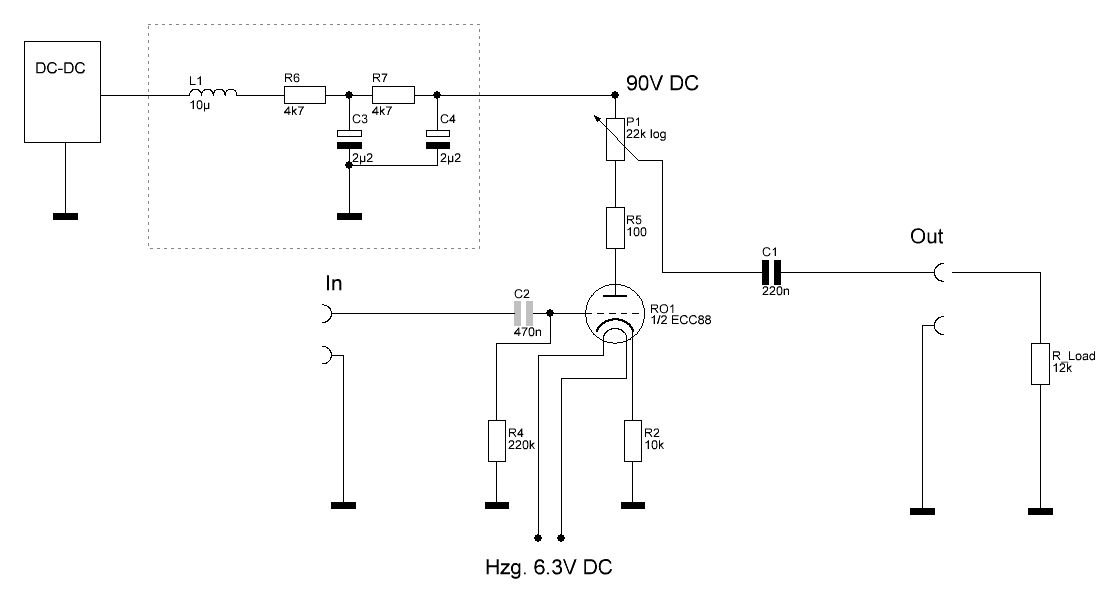 Hallo Kioskman, so klein wie möglich wäre blöd gesprochen, aber Faktor 10 kleiner wäre schön. Die Röhre läuft eigentlich als Buffer und "Harmonische-Generator", derzeit mit einer Verstärkung von 2. Der MAX9704 geht mit knapp 30dB ran, da sind 200mV schon wahrzunehmen. Da der Rauschteppich ja "HV" ist, sollte man nicht glauben, dass bei 1.1V_p Signal 200mV_p es unglaublich schlecht klingen lassen. Wenn man den Pot voll aufdreht, hört man ihn halt, wenn kein Signal anliegt. Leider konnte ich im Web nichts verwertbares finden, wie man HV sinnvoll filtert/siebt und berechnet. :/ Eventuell wäre eine stromkompensierende Drossel eine Option? Lieben Gruß Christian