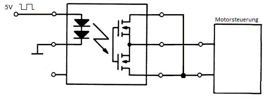 Die Quelle ist eine Motorsteuerung. Der Motor wird drehrichtungsabhängig mit +- 24 V betrieben. An der Steuerleitung sind Endschalter für den Motor angebracht (Reed-Schalter). In Reihe mit diesen Endschaltern ist ein Jumper gesetzt. Hier kann ein weiterer Schaltimpuls für den Motor eingebracht werden. An dieser Stelle möchte ich den Motor über ein PWM Signal steuern. Leider kann ich nicht mehr über die Motorsteuerung sagen, da ich kein Schaltplan und kein Datenblatt habe. @ stkl Zum Probeaufbau hatte ich zwei 1N 4148 verwendet, da gerade keine anderen zur Verfügung standen. Ich habe mich mal über PhotoMOS-Relais informiert. Könnte die Beschaltung wie im Anhang beschrieben funktionieren? @ Gerhard K. Sehr interessanter Lösungsansatz. Ich werde das mit dem Gleichrichter mal ausprobieren. Daniel