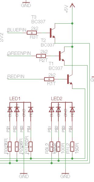 Vielen Dank für eure Antworten. Demnach kann die Schaltung so aufgebaut werden. Wie ich aber aus den Texten lese, sind die Widerstände der LEDs falsch dimensioniert. Verstehe ich das richtig: Wenn der Basiswiderstand weggelassen wird, so wird die LED mit etwa 4V versorgt. Wieso leuchten die LEDs aber mit den verwendet Werten trotzdem so hell, als ob man diese mit 5V direkt versorgt?