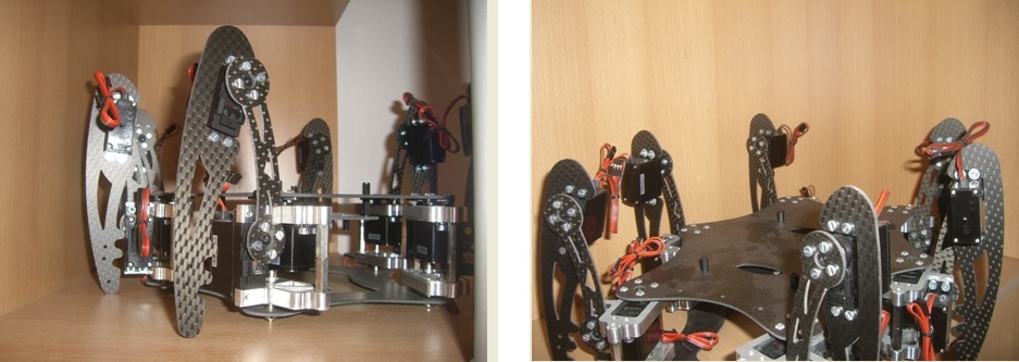 Hallo Christoph, ich baue momentan auch einen HexaPod. Meine Servo-Controller bestehen aus 2x Atmega8 und einen UART Bus. So habe ich die Möglichkeit, meine Steuerbefehle über den Computer zu senden und später wird ein eigener IC die Berechnung übernehmen. Als Alternative für den UART Bus habe ich auch I2C vorgesehen. Ich werde als 1. die Positionen mit festen Punkten umsetzen. ( A->B->C->D->E->F-->A). Wenn der Bewegungsablauf dann passt, werde ich die Bewegungen in Mathematische Formeln umwandeln. http://youtu.be/cX8kUJz2Isc?hd=1 Gruß, Sascha