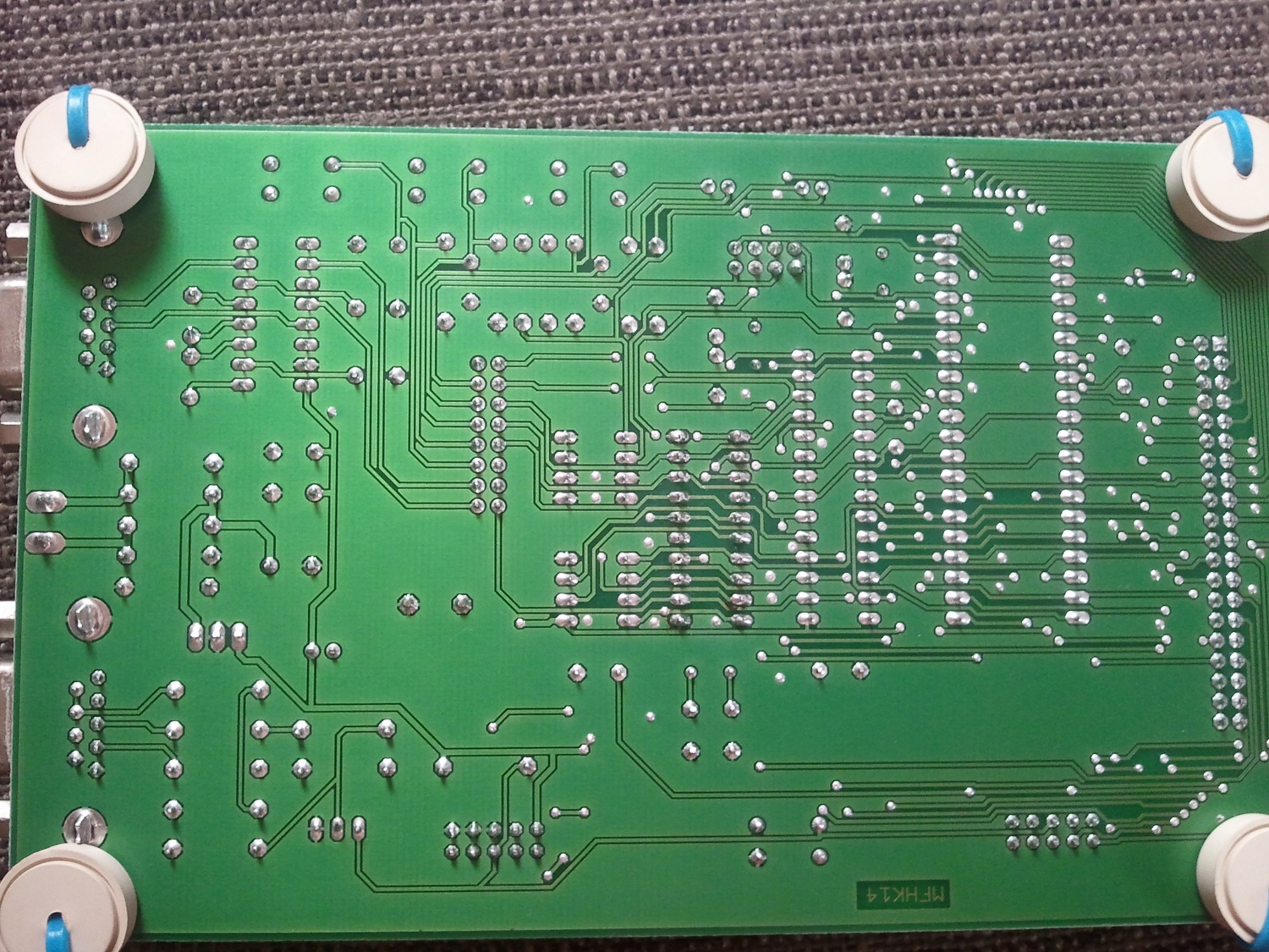 Sieht so aus wie mein Pollinboard. Messe mal von + nach Masse ob da ein Kurzschluß vorliegt. Ich betreibe das Board allerdings mit Wechselstrom, aver das sollte egal sein. Ich habe keine Jumper zwischen den 2 roten Leds. Der MAX232 steckt auch richtig drin. Wenn die Printplatte nicht Mist ist, dann suche einmal nach optischen Fehlern, ob z.B. irgendwo eine Zinnkugel einen Schluß macht. Welche Messinstrumente hast du zur Verfügung? LG Rudi