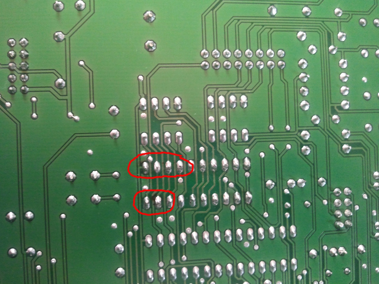 Auf dem letzten Bild ist der Kurzschluss nun wirklich deutlich zu sehen. Links, ca. 1 cm über den roten Kringeln ist eine Zinnbrücke vom Reglerausgang nach Masse.