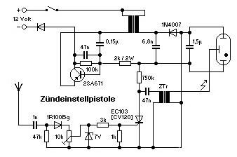 Wenn sich denn keiner meldet... Ich habe in meinen frühen Bastlertagen mal so etwas gebaut (Käferzeit). Ich habe es noch verstaubt in einer Ecke gefunden. Es hatte prima funktioniert, ich habe es dann aber kaum benutzt. Der Aufbau ist sehr primitiv und einfach. Ein Miniatur Trenntrafo lädt über eine Gleichrichterbrücke einen Kondensator auf ca. 350V auf. Minus wird mit Minus des Akkus verbunden. Jetzt wird es heikel: über ein Stück Zündkabel wird die Zündspannung zur Entladungsröhre geführt und ist dort einfach mit einer Windung in der Nähe des Minus-Anschlusses um die Röhre gewickelt. Wo ich damals die Zündspannung abgegriffen habe? Ich glaube direkt vom Kerzenstecker von Zylinder 1. Nachahmung wird nicht empfohlen. Ich mag das jedenfalls nicht mehr betreiben. Früher gab es viele waghalsige Schaltungen.