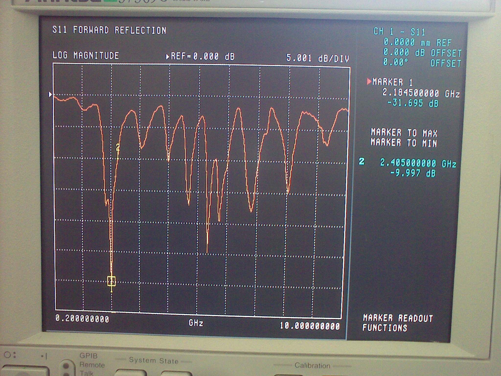 hi leute, ich hab ein problem mit einem einfachen hf-design. mein aufbau ist folgender: ich habe eine kleine platine auf der sich ein u.fl-stecker befindet, über welchen das hf-signal von einem funkmodul zugeführt wird. der stecker ist an eine gerade coplanarleitung angeschlossen, die ich mit diversen internettools auf 50ohm berechnet habe. am ende der leitung befindet sich eine 2,4ghz chipantenne (AT9520-B2R4HAA). GND ------------------ U-FL O------------------[|||||||] Antenne GND ------------------ grundsätzlich funktioniert dieser aufbau, jedoch hatte ich mir etwas mehr reichweite erhofft. also habe ich den aufbau mal in der hochschule an einen netzwerk analysator angeschlossen. das ergebnis überraschte mich etwas. das system ist perfekt für 2,18ghz angepasst und erreicht einen reflektionsfaktor von ca -31dB. bei den gewünschten 2,4ghz beträgt dieser nur noch knapp -10dB. (bild der messung ist angehängt. auf den relevanten frequenzen sind marker platziert.) nun bin ich am rätseln, wodurch ich die resonanzfrequenz verstimmt haben könnte. ich kann mir nicht vorstellen, dass die antenne selbst schuld daran ist. andererseits ist das design auch nicht sehr komplex, sodass man eigentlich nicht soo viel falsch machen kann. ich bin für jeden tip dankbar. gruß tobias