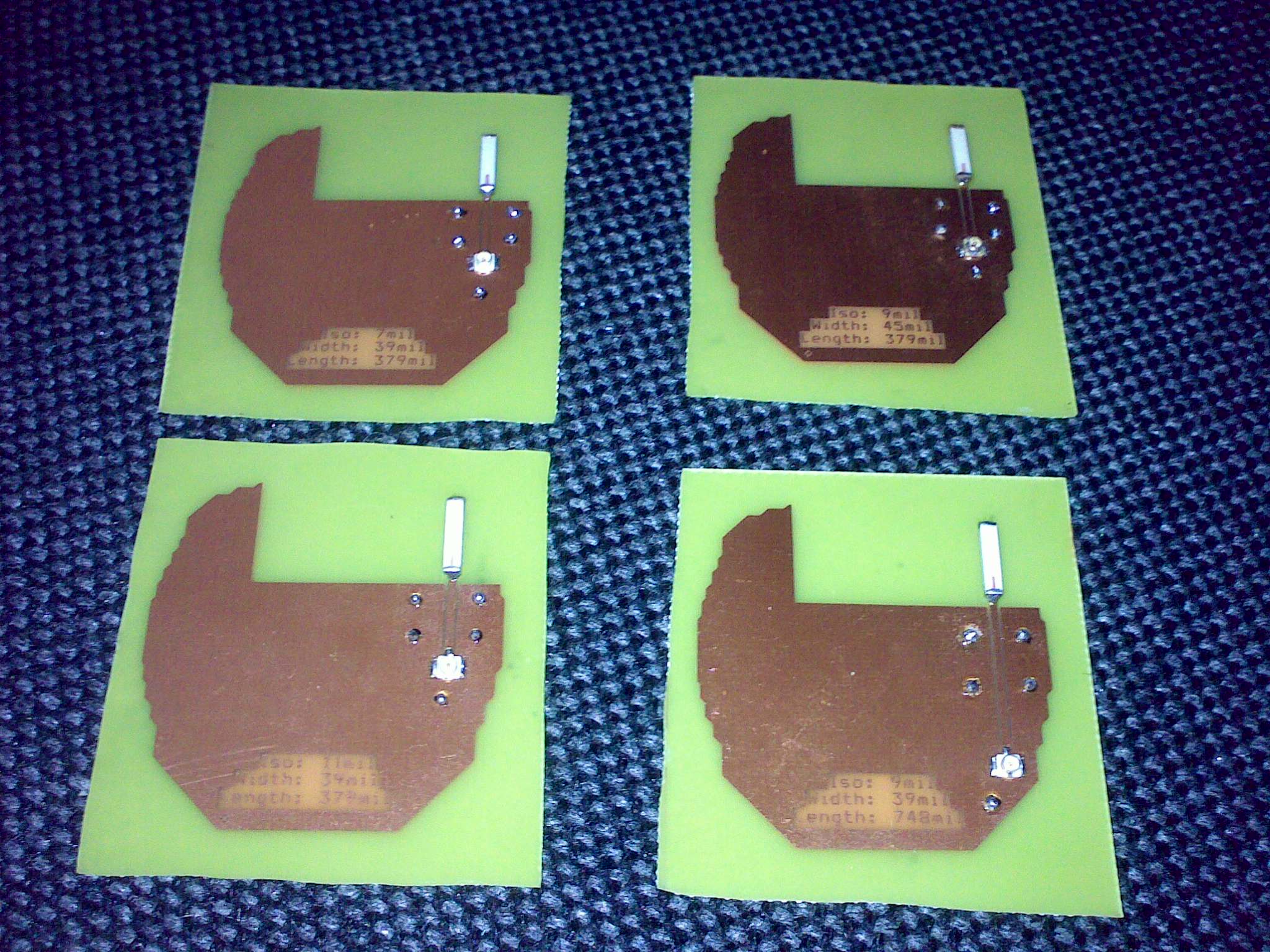 hi, erstmal vielen dank für eure antworten. @lukas k.: als epsilonr habe ich 4,3 angenommen. dies soll laut internet ein ungefähr passender wert bei 2,4ghz für fr4 sein. die geplante länge der zuleitung ist gut 9,6mm lang. ein bild mit vier meiner testplatinen habe ich angehangen (platinendicke : 0,8mm) @winfried j.: um probleme des belichters auszuschließen habe ich mal mehrere platinen mit leicht variierenden zuleitungsabmaßen angefertigt und diese einzeln vermessen. das ergebnis war, dass keine veränderung der zuleitung eine relevante resonanzfrequenzverschiebung bewirkt hat. der speisepunkt der antenne passt auch. die größe der lötpads entspricht der im db angegebenen. die massefläche auf der rückseite sieht aus wie auf dem angehängten bild, natürlich ohne die zuleitung und die antennenpads. @neubi: verschiedene unterlagen habe ich noch nicht überprüft. das testboard lag beim vermessen auf einem gewöhnlichen labortisch. ich kann mir nicht vorstellen, dass dieser diese extreme verschiebung verursacht. ich werde es beim nächsten messen jedoch überprüfen. morgen werde ich mal ein weiteres testboard genau nach den angaben im datenblatt anfertigen und damit die antenne vermessen. mal schaun was dabei herraus kommt. vielen dank nochmal und wenn ihr weitere ideen habt, immer her damit. gruß tobias