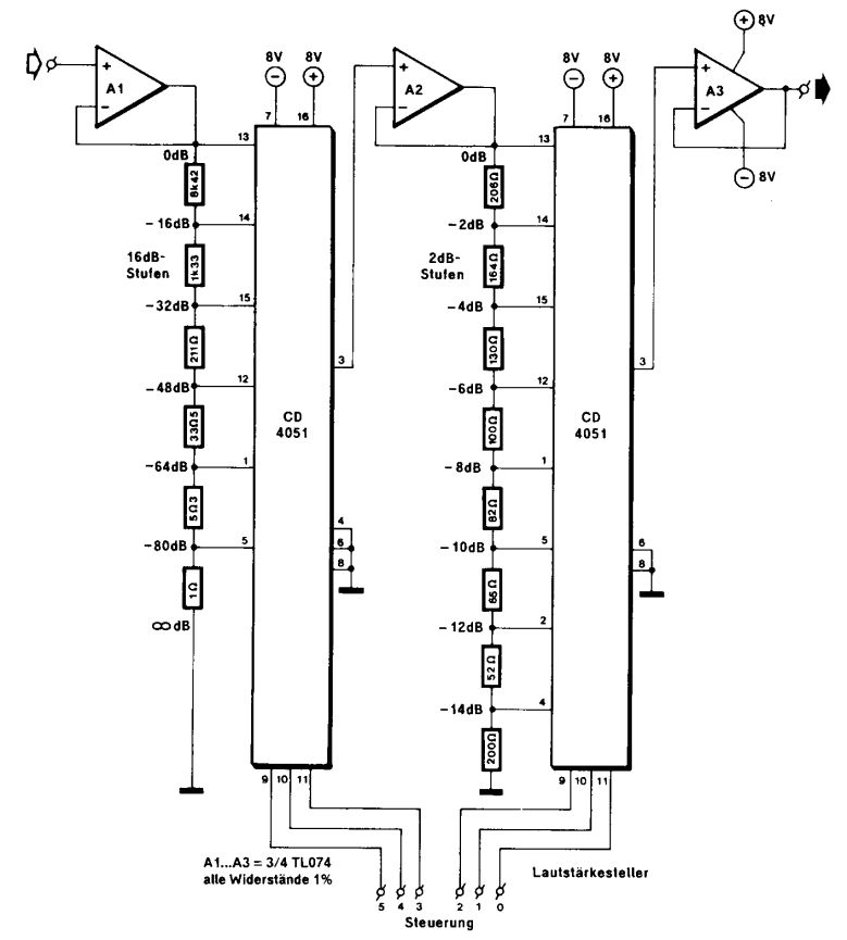 Hallo! Ich suche eine Möglichkeit eine digitale Lautstärkeregelung in eine Schaltung zu integrieren. Da ich zwar gelernter Kommunikationselektroniker bin, jedoch schon lange nichts mehr auf diesem Gebiet gemacht habe hätte ich gerne eure sachkundige Hilfe erbeten. Folgendes Problem: Bei der Arbeit haben wir ein Radio, was jedoch aufgrund von vielen Abnehmern jeweils über einen 100 Ohm Übertrager die Signale an die Endstelle liefert. Der Grund: Baut einer der Kollegen einen Kurzschluss ist nicht das gesamte Radio betroffen. Da das Signal also sehr hochomig ist kommen die einzelnen Arbeitsplätze nicht um einen Verstärker umher. Deswegen wird für jeden Arbeitsplatz einen solchen benötigt. Da ich gerne bastle und immer wieder ein neues Projekt suche möchte ich dies nicht wie "üblich" normal über ein Poti machen - sondern nach Möglichkeit über einen µC, welcher evtl. auch noch die Lautstärke über LEDs anzeigt. Die Schaltung im Anhang habe ich im Internet gefunden (kleine Änderung: eigentlich ist R2 2,2 Ohm und R1 220 Ohm). Das würde aber viel zu laut werden bei einer Verstärkung von 100. Deswegen die Änderung. Meine Idee um das geplante umzusetzen: Ersetze R2 durch mehrere Widerstände, die jeweils über den Atmega (je nach Lautstärke) gegen Masse geschaltet werden. Bedeutet: für sehr leise würde ein 10k (oberer Anschluß) an den Ausgang vom µC (unterer Anschluß) angeschlossen werden und dieser auf LOW gesteuert werden. Für lautere Einstellungen eben ein etwas kleinerer Widerstand über einen anderen Port. (Deswegen auch die Änderung von R1 um Faktor 10 nach oben um den Ground-Strom von Seite des µCs zu schaffen.) Die Frage ist: Würde das funktionieren oder mache ich einen Denkfehler?