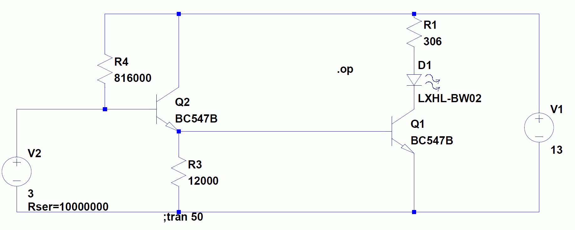 Es gibt sehr viele Ansätze mit vielen Bauteilen in allen mehr oder wenniger verrückten Kombinationen. Deswegen habe ich es am Anfang gesagt dass ich es lieber etwas konkreter hätte, sonst hilft es nicht wirklich. Es ist warscheinlich vielen entgangen, dass der der rechte Transistor Q1 heisst und der linke Q2. Um Q1 mache ich mir keine Sorgen, wie eine LED durchschaltet weiss ich und das steht überall im Netz drin. Weil mit Transistoren wir nicht weiter kommen, habe ich einen kleinen Ausflüg ins OP-Land gemacht, aber nur in PSpice :) Am Eingang ist V2 mit -0,9V geschaltet R1 und R2 als Spannungsteiler dass Ref. von 1V einstellt D1 ist 3,6V Z-Diode mit R3 als Vorwiderstand, je nach Umstand steuert hier die Spannung den Strom an LED was einfach zu hoch für LED werden kann. Deswegen Z-Diode. R6 simuliert LED(3,6V 40mA) weil ich kein passendes model für LED gefunden habe Also von 0-0,99V bleibt LED dunkel und von 1V aufwärts und von 0 abwärts(ins negative) leuchtet es. mich stört natürlich dass LED auch bei negativen Werten leuchten kann, hat jemand eine Idee wo man am besten eine Diode plzieren könnte, dass es nur positive Spannungen berücksichtigt werden. kann es sein dass Z-Diode die Schaltung etwas zu viel "verlangsammt" ?