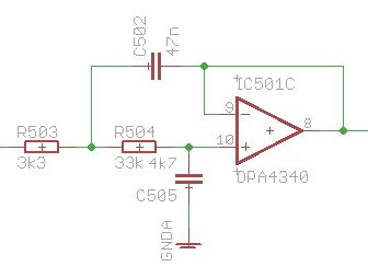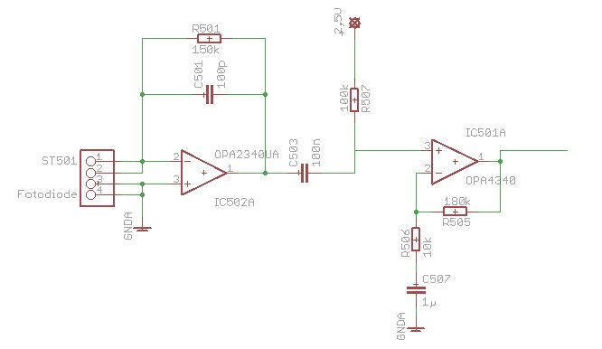 ja, Erfahrung und Mustererkennung, das hatte ich befürchtet. LTSpice ist kostenlos sehe ich gerade... super :) Hätte ich ja nicht gedacht. Also gut: Kondensator ist hochohmig für DC und der Widerstand nimmt ab mit wachsender Frequenz. Hätte ich selber wissen müssen, aber auf diese Formulierung mit dem Widerstand bin ich nicht gekommen. Ich versuchs mal: IC502A: (siehe Schaltung) Aus Erfahrung weiß ich, dass es ein Transimpedanzverstärker mit Tiefpassfilter sein muss ;) R501 legt die Verstärkung fest und C501 sorgt für geringere Verstärkung bei hohen Frequenzen. Der Ausgangswert liegt zwischen 0 Volt und Versorgungsspannung. C503 lässt nur Wechselspannung passieren und mit R507 wird der Nullpunkt auf 2,5 Volt gelegt. IC501A: Der OpAmp will dafür sorgen, dass an den + und - Eingängen dasselbe Signal anliegt, welches um 2,5 Volt schwingt. Der Rückkopplungszweig besteht aus einem frequenzabhängigen Spannungsteiler nach GND. Bei niedrigen Frequenzen ist C507 hochohmig -> an C507 und R506 fällt mehr Spannung ab -> mehr Gegenkopplung -> weniger Verstärkung ??? Hm also einen Hochpass erwarte ich hier nicht. IC501C: Der OpAmp hat direkte Gegenkopplung, arbeitet also bloß als Spannungsfolger. R504 und C505 bilden ein RC-Glied mit 1KHz Grenzfrequenz. R503 und C502 sind mir schleierhaft.