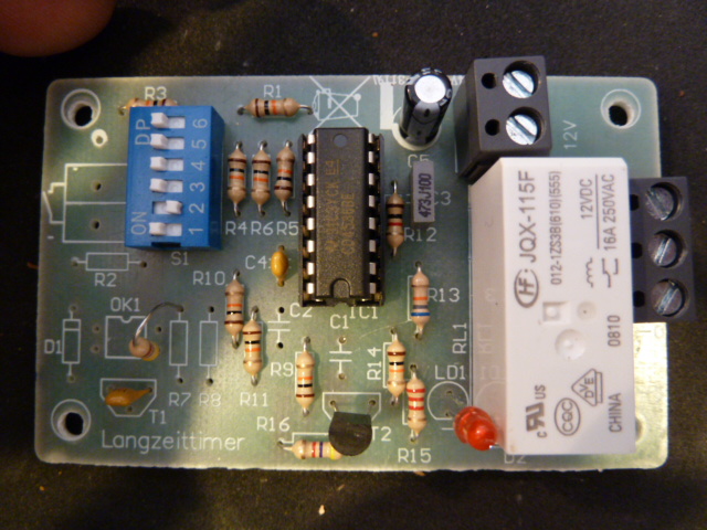 So, hab jetzt mal den Conrad Bausatz mit Modifikation aufgebaut. Aufgabe des Bausatzes: Bei Einschalten der Spannung für mehrere Stunden einschalten und dann ausschalten. Reset durch wegschalten der Spannung und Wiedereinschalten. Man sieht ein paar nicht bestückte Teile, und ein paar "Falsch" bestückte Teile. Statt per Taster wird der Impuls über einen RC beim Einschalten der Spannung gegeben. Es dient dazu, Lampen und Geräte, die wegen Vergesslichkeit an gelassen wurden, nach mehreren Stunden automatisch auszuschalten. Wir haben im Haushalt leider eine sehr vergessliche und demente, ältere Person. Ich will jetzt alle wichtigen Lampen/Elektrogeräte mit automatischer Abschaltung versehen. Teilweise brennt das Licht sonst Tagelang, wenn ich nicht täglich Kontrollgang mache. Und beim Herd könnte das anlassen sogar gefährlich werden. Auf die genaue Zeit kommts nicht an, daher brauchts auch kein uC zu sein. Das Toleranzfenster ist im Minuten bis Stundenbereich je nach Gerät. Als Lastschalter werde ich vermutlich HAGER Installationsrelais benutzen, so dass ich keine 230V über die Conradplatine laufen lassen muss. Habe da etwas Bedenken. Ich muss mal kalkulieren, was das Gerät in 10-20 facher Ausführung kostet, und ob ich da mit einer hergestellten Platine billiger fahre. Vor allem könnte ich dann das Steuernetzteil auch noch mit auf die Platine packen und müsste nicht noch einen Conrad Netzteilbausatz mit dazu kaufen.
