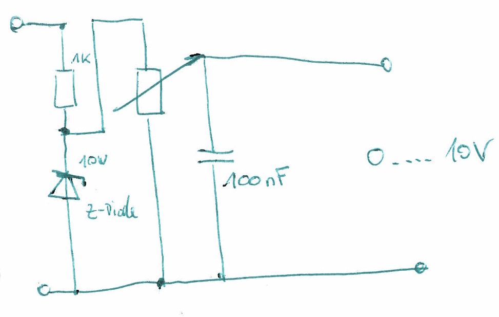 Hallo! Ich hätte folgende Frage: Ich habe ein 12V Steckernetzteil dessen Spannung ich über ein 10k Poti regeln möchte. Das funktioniert auch ganz gut. Jedoch möchte ich nun die maximale Spannung auf 10V begrenzen, da ich diese für eine LED Steuerspannung verwende, welche zwischen 0-10V liegen muß. Versucht habe ich es schon mit einer Zenerdiode 10V parallel zur Spannungsquelle 12V. Die wird aber nur heiß... Kann ich das ev. auch mit einem 10V Festspannungsregler machen? Oder ist die Spannung dann konstant 10V ohne diese über das Poti regeln zu können? Vielen Dank vorab für eure Hilfe! LG Christian