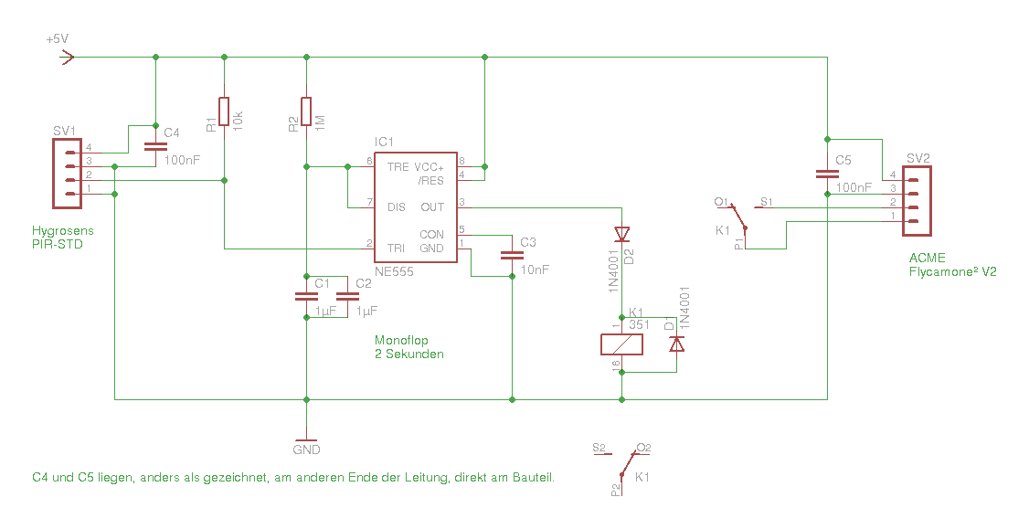 Hallo! Den Elko werde ich versuchen. Den Schaltplan reiche ich noch nach. Gestört wird ein Bewegungsmelder ( http://shop.hygrosens.com/Sensormodule-acma/Passiv-Infrarot-Bewegungsmelder/Miniatur-Bewegungsmelder-acma.html ) Mit dem Open-Collektor-Ausgang triggere ich einen NE555-Monoflop, darüber wird ein Relais angesteuert, welches wiederum die Kamera auslöst (potentialfreier Kontakt). Solange die Kamera nicht angeschlossen ist, funktioniert das alles einwandfrei. Ist die Kamera angeschlossen, ist der Ausgang des Bewegungsmelders unregelmäßig am Flackern. Ich habe an anderer Stelle schon gelesen, daß der Bewegungsmelder recht empfindlich auf Störungen (auch Leuchtstofflampen etc) reagiert. (Es war keine Leuchtstofflampe an.) Wenn ich übrigens die Kamera über den internen Akku versorge und neben den Bewegungsmelder halte, ist keine Störung vorhanden. Das Netzteil ist DC, die Schaltung funktioniert wie gesagt ohne Kamera. Bye! Ronny