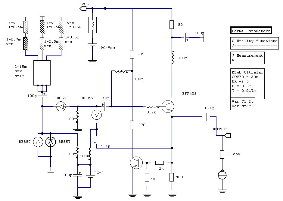 Hier habe ich den Schaltplan des VCOs angehängt welcher nach dem Studium der von euch angegebenen Quellen und dem Buch von U.Rohde entstanden ist. Noch fehlt die Pufferstufe und er ist noch nicht auf geringes Rauschen optimiert. Die Frequenz geht laut Simulation von 800MHz bis 2.6GHz allerdings habe ich nur die wichtigsten Elemente per Transientenanalyse modeliert. Ich werde mal einen Versuchsaufbau machen und die Ergebnisse verifizieren und versuchen die Simulation mit HB zum Laufen zu bekommen. Gruß Dietmar