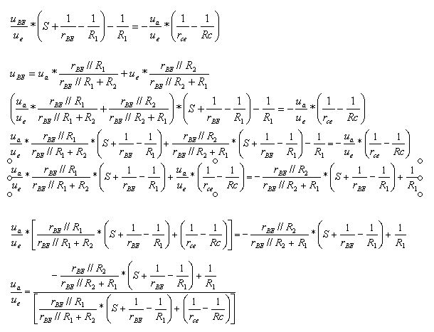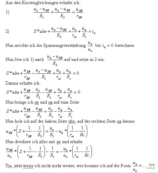 Hallo, hier eine Knotengleichung aus dem Tietze/Schenk S. 137 Kollektorschaltung Mittels dieser sollte man imstande sein verschiedene Kenngrößen(ua/ue,re,ra) zu berechnen. Leider ist die Herleitung nicht angegeben und tue mich schwer diese Knotengleichung zu lösen Kann mir da jemand auf die Sprünge helfen? P.s.In diesem Buch sind mehrere Kleinsignalersatzschaltbilder mit Knotengleichungen und deren Lösung(ohne Herleitung)angegeben Nur selten bin ich imstande auf die richtige Lösung zu kommen Vielleicht gibt es ja Tricks diese einfach zu lösen?