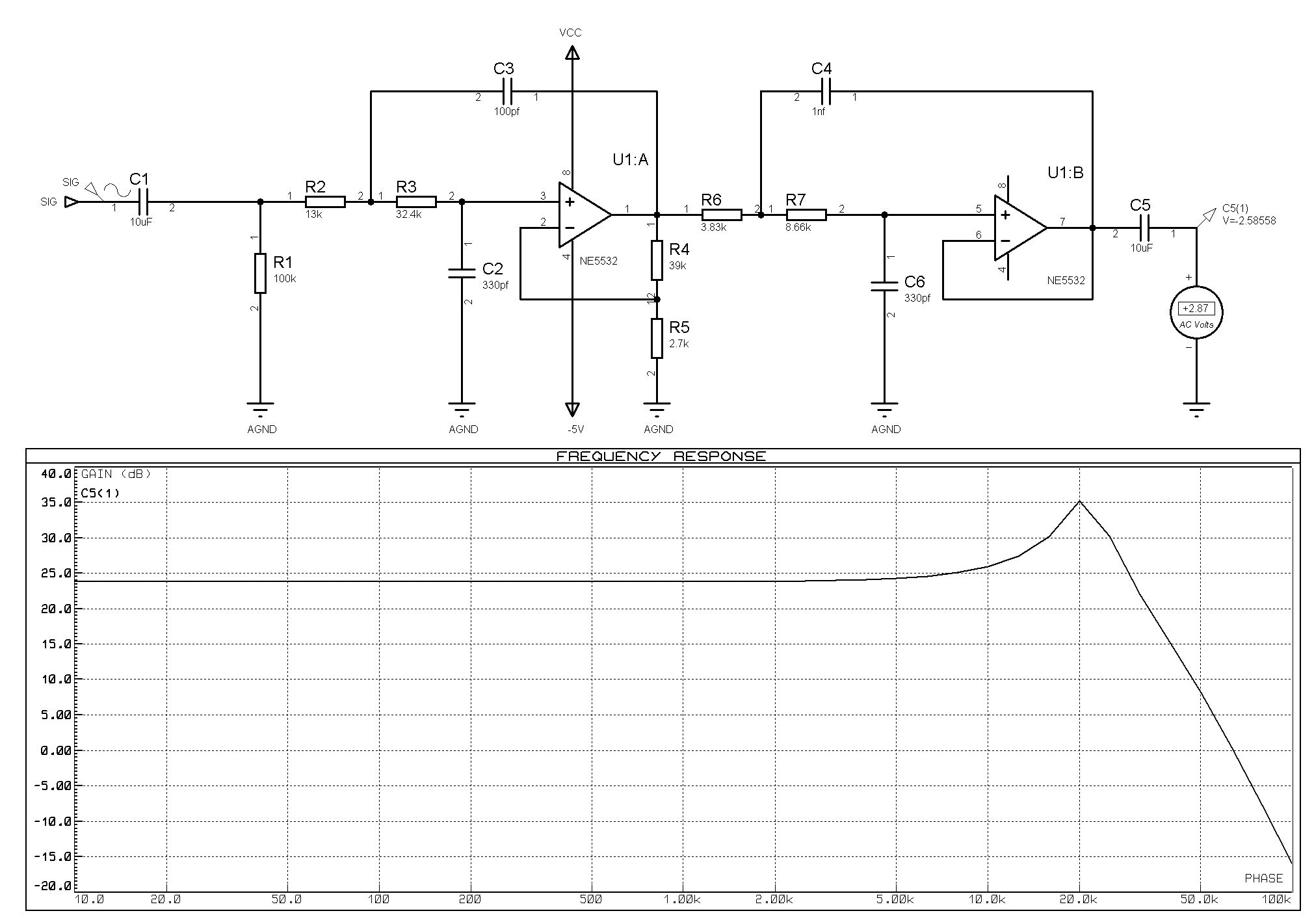 Also ich glaube, du bist da auf einem Holzweg. R4/R5 = 82, das ergibt doch eine viel zu hohe Verstärkung für ein Sallen-Key-Filter mit einer Grenzfrequenz von 30kHz.