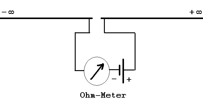 Ich habe mir mal folgendes Gedankenexperiment überlegt: Da sind zwei unendlich lange Drähte. Der eine verschwindet nach rechts in die Unendlichkeit. Der andere verschwindet nach links in die Unendlichkeit. Siehe Zeichnung. Was würde ich mit einem Ohm-Meter zwischen den beiden Drähten messen können?