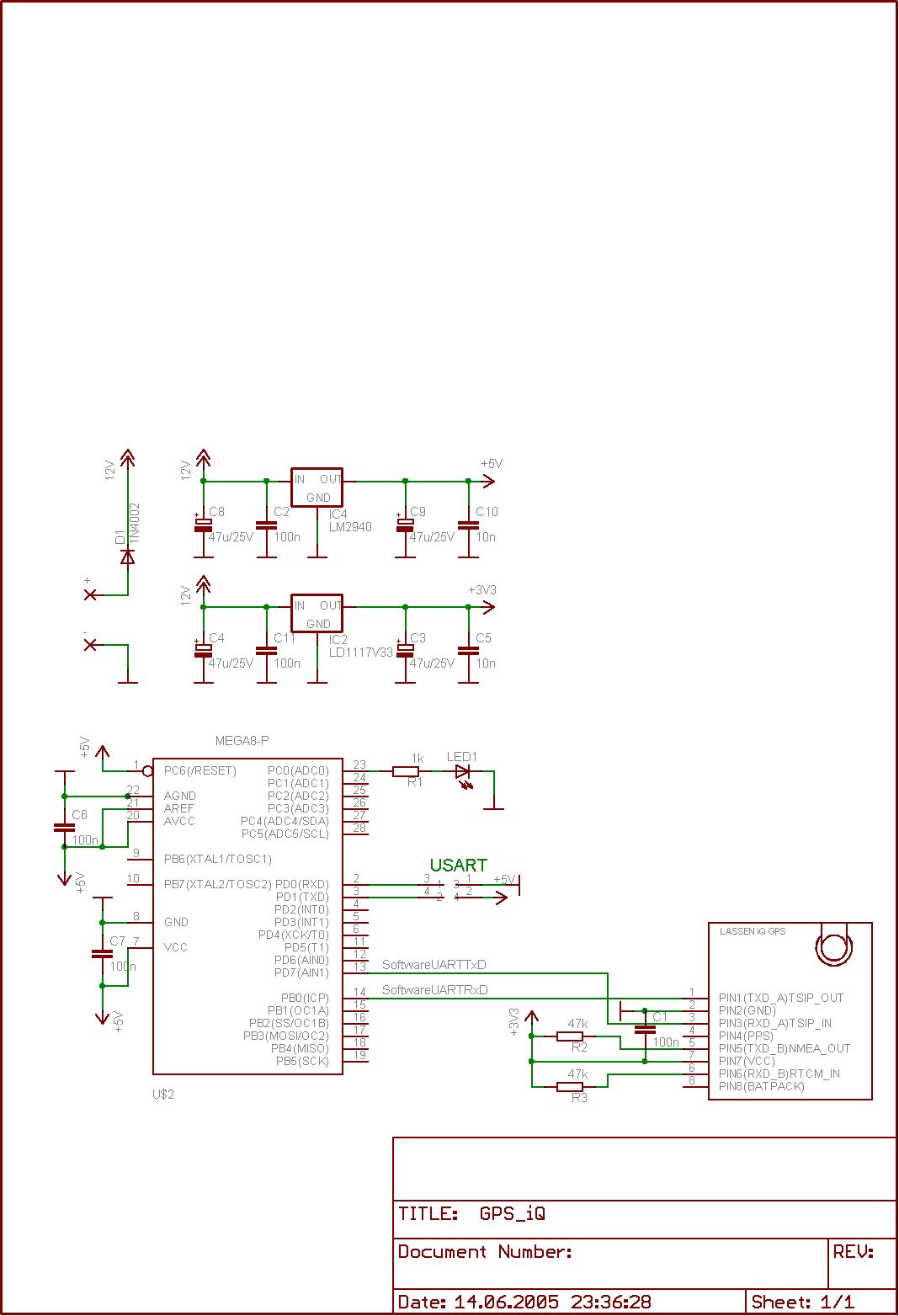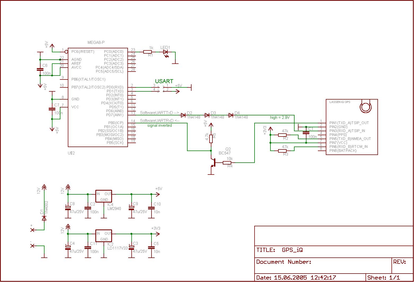 Hi Uwe, das wäre nett, wen du mir die Datei schicken könntest. Die Schaltung habe ich nun um einen einfachen Logic-Level-Translator in Form von eines Transistors (Richtung GPS -> AVR) und drei Dioden (Richtung AVR -> GPS) ergänzt. Das Tx-Signal vom GPS wird zwar von dem Transistor negiert, aber durch die Verwendung eines Software-UART (wiederrum basierend auf Pascal Stang-s AVRLib )ist dies kein Problem. Gruß Zoltan