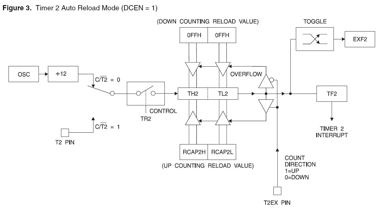 Da steht es: A logic 0 at T2EX makes Timer 2 count down. The timer underflows when TH2 and TL2 equal the values stored in RCAP2H and RCAP2L. The underflow sets the TF2 bit and causes 0FFFFH to be reloaded into the timer registers. Es wird beginnend von FFFF heruntergezählt und bei Übereinstimmung von TH2, TL2 mit RCAP2H and RCAP2L der Overflow mit "Reload FFFF" ausgelöst. Gruß Holger