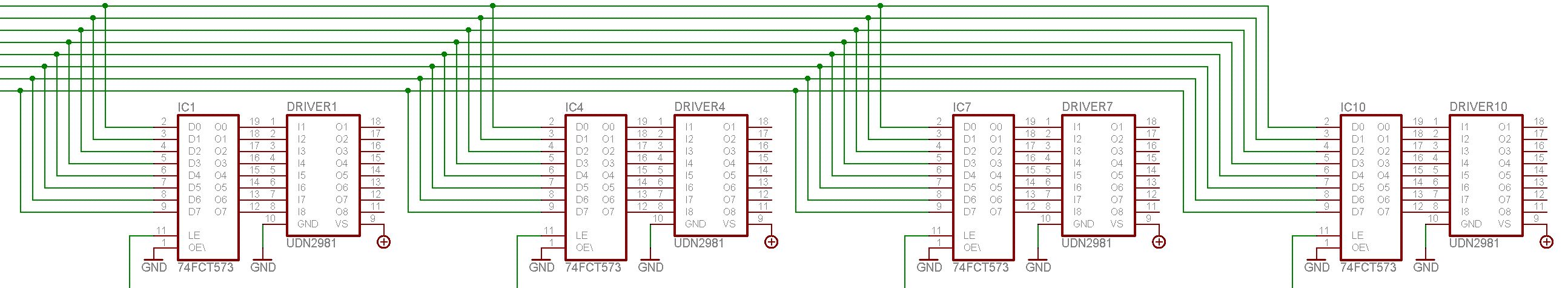 > so hier nochmal der schaltplan Jetzt sieht's doch gut aus. Statt 573 und 2803 kann man TPIC6B505 nehmen, als PMOSFET eignet sich IRF7304/7314/7324, und + für die LEDs muß dieselbe Spannung sein wie + für den uC.