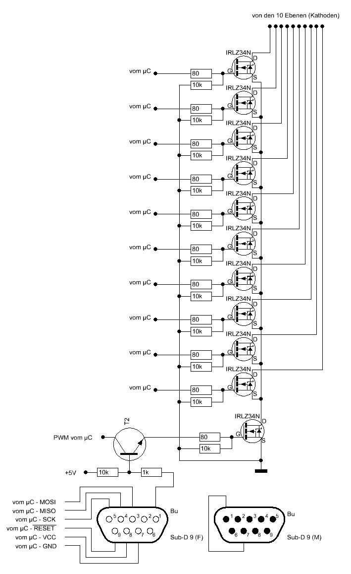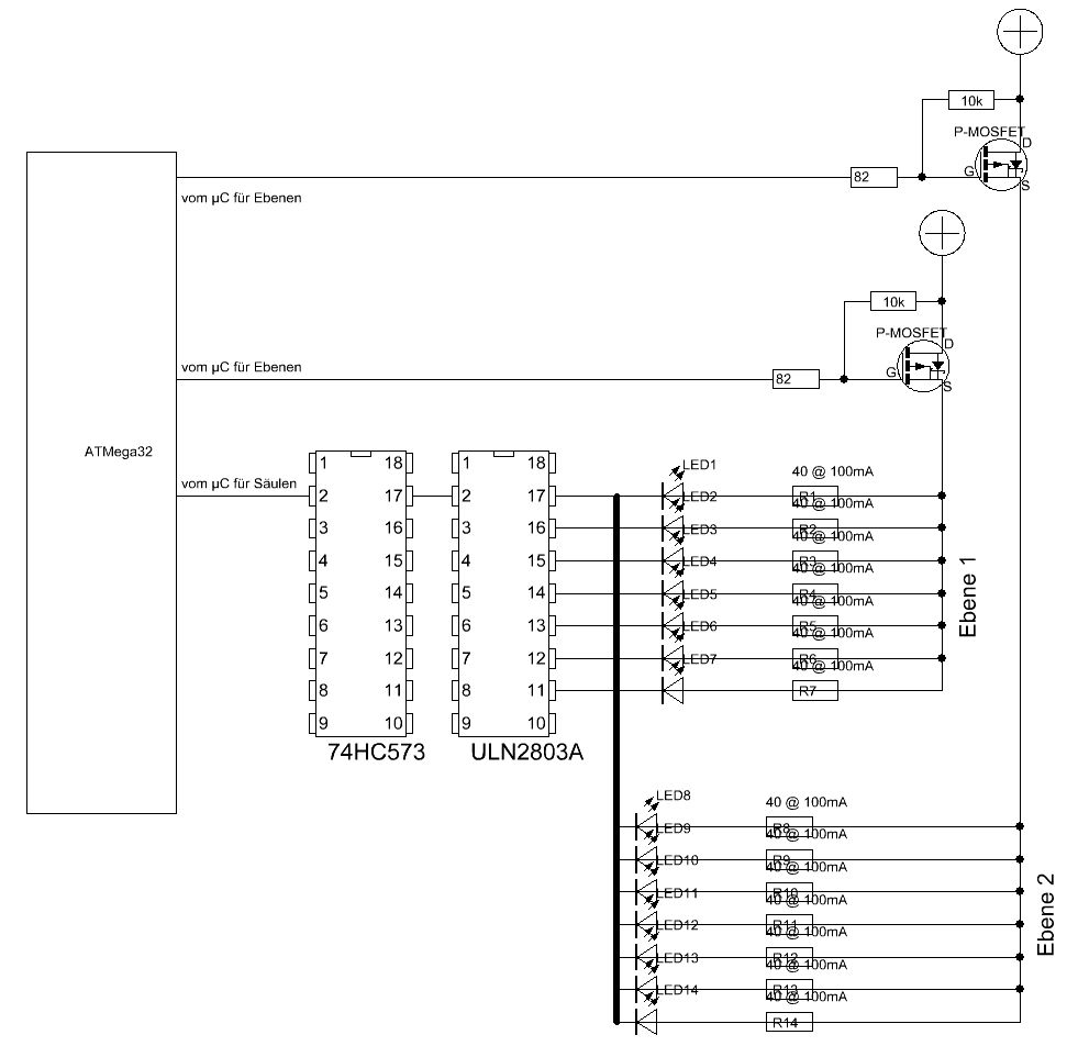 Hier habe ich mal die Ebenensteuerung rausgesucht (stammt aus einem anderen Cube (8x8x8)) habe ich dann auch 10 erweitert. der lila transistor ist zur pwm da. auch das funktioniert in einem anderen würfel schon... also ich habe folgende IC's: ATMega32 (nicht L) SN74HC573N den UDN2981 wollte ich noch kaufen...