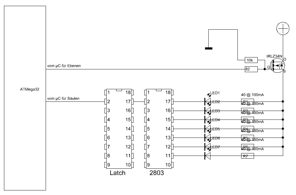 ok, fassen wir mal zusammen... entweder man macht es mit gemeinsamen Kathoden -> zuerst die 74hc573...danach die UDN2981 dann die Rv und dann zu den säulen -> led's mit 80 bis 100mA -> dann die ebenen werden mit dem IRLU024N auf gnd geschaltet -der UDN2981 wird mit > 5V betrieben... Nachteil...UDN ist teuer oder mit gemeinsamen Anoden wie im Post vom 08.10.2011 09:09 Nachteil... nicht weniger als 5V am ULN2803 was eng werden könnte für den Rv VR = 5V(VCC)-0.4V(PNP)-0.1V(MOSFET)-3.8V(LED) = 0.7V siehe post vom 08.10.2011 15:54