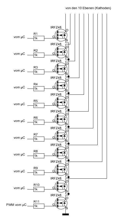 Ja, es ist ein extra Stromkreis, der allerdings von der gleichen Spannung versorgt wird, wie der Mikrocontroller und die sind 5V. Die IRF7304/7314/7324 sind alle ungeeignet, weil zu hochohmig: Du willst schließlich pro LED 100mA fließen lassen, womit sich einen maximaler Ebenenstrom von 10A ergibt. Da kommen die Jungs schon ordentlich ins Schwitzen, zumal 2 Stück pro Gehäuse. Eine sinnvollere Alternative finde ich auch nicht :-/ Ich täte bei der Version mit N-Kanal-MOSFETs bleiben.