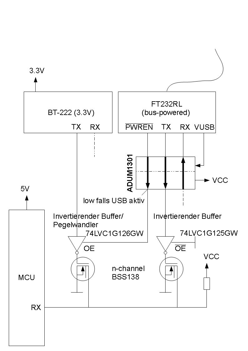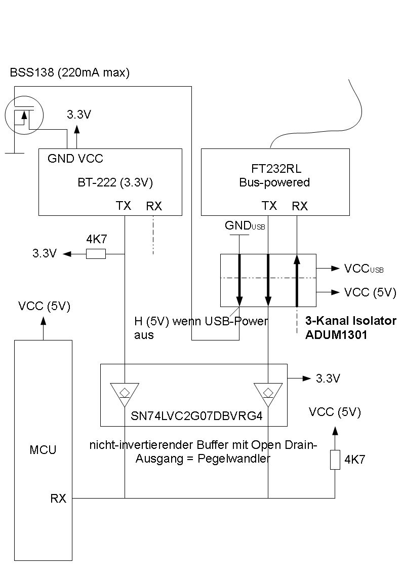 Oder so, BT-222 vom Strom trennen? Bei dieser Lösung weiss ich nicht, ob ein Pullup den Ausgang eines abgeschalteten BT-222 auf High ziehen kann (damit der Buffer zur Pegelwandlung RX nicht auf Low zieht).
