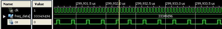 Generator schrieb: > Sendet man FF FF FF FF so liegen bei 20MHz Masterclock 20MHz am Ausgang. Nicht ganz: es liegen dann rechnerisch (2^32-1)*20MHz/2^32 = 19,99999999953 MHz an. Tatsächlich ist das dann aber ein Decrement um 1 und damit eine Frequenz von 20MHz/2^32. Shannon lässt grüßen... > ergibt 4000,1229988MHz am Ausgang. > ergibt 4000,4319977MHz am Ausgang. So einfach geht das aber nicht! Mit 20MHz Eingangstakt ergibt das einfach ein Signal mit 4MHz, das immer wieder mal "jittert", weil ein "Korrekturtakt" eingefügt werden muß. Im Anhang ist das zu sehen: aus den 20MHz werden mit 33349d96 genau 4 MHz erzeugt, die ab&zu mit einem "kürzeren" Impuls auf die 4000,4319977MHz "aufgebhohrt werden (Screenshot)... :-o Im "langjahrigen Mittel" passt die Frequenz, kurzzeitig betrachtet ist sie auf ganzzahlige Teile von 20MHz beschränkt. Deshalb meine Fragen nach dem Jitter aus dem Beitrag "Re: Suche SPI verstellbaren Takt"